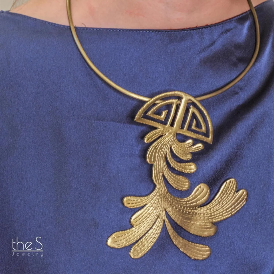 Kiềng đồng Gingko lấy hình lá bạch quả – biểu tượng của ký ức bền lâu – được gò thủ công bởi các nghệ nhân Hà Nội. Ánh vàng dịu ôm cổ, nữ phối áo dài thì trang nhã cổ điển, nam khoác sơ mi linen lại phóng khoáng hiện đại; một thiết kế unisex đủ tinh tế để đi làm, đi triển lãm, hay dạo phố chiều mùa thu.
