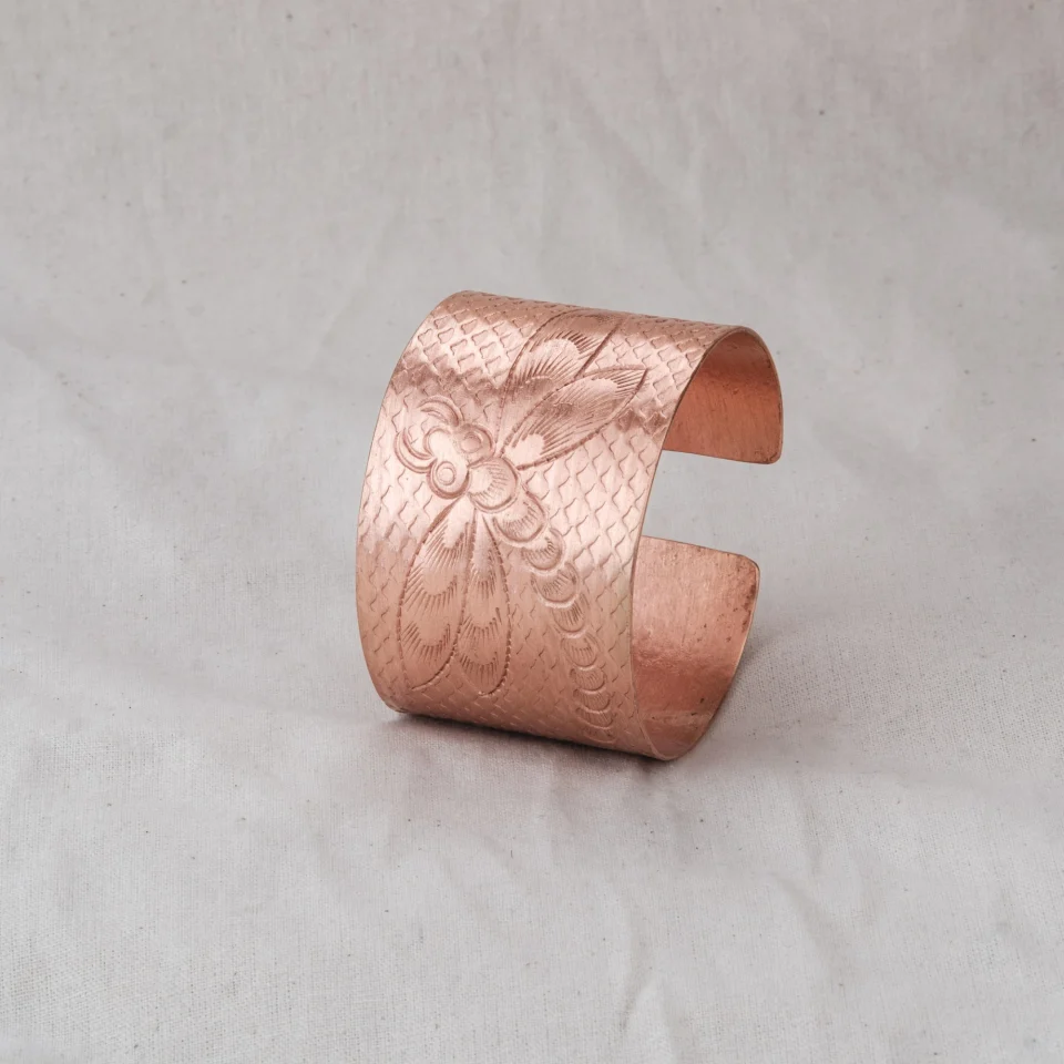 Vòng tay chạm chuồn chuồn bản lớn, bề mặt gõ thủ công, khắc hình chuồn chuồn thanh mảnh. Ba phiên bản: đồng đỏ, đồng thau và mạ bạc – mỗi sắc độ gợi một vẻ đẹp riêng: trầm ấm, sang nhã hay tinh tế.