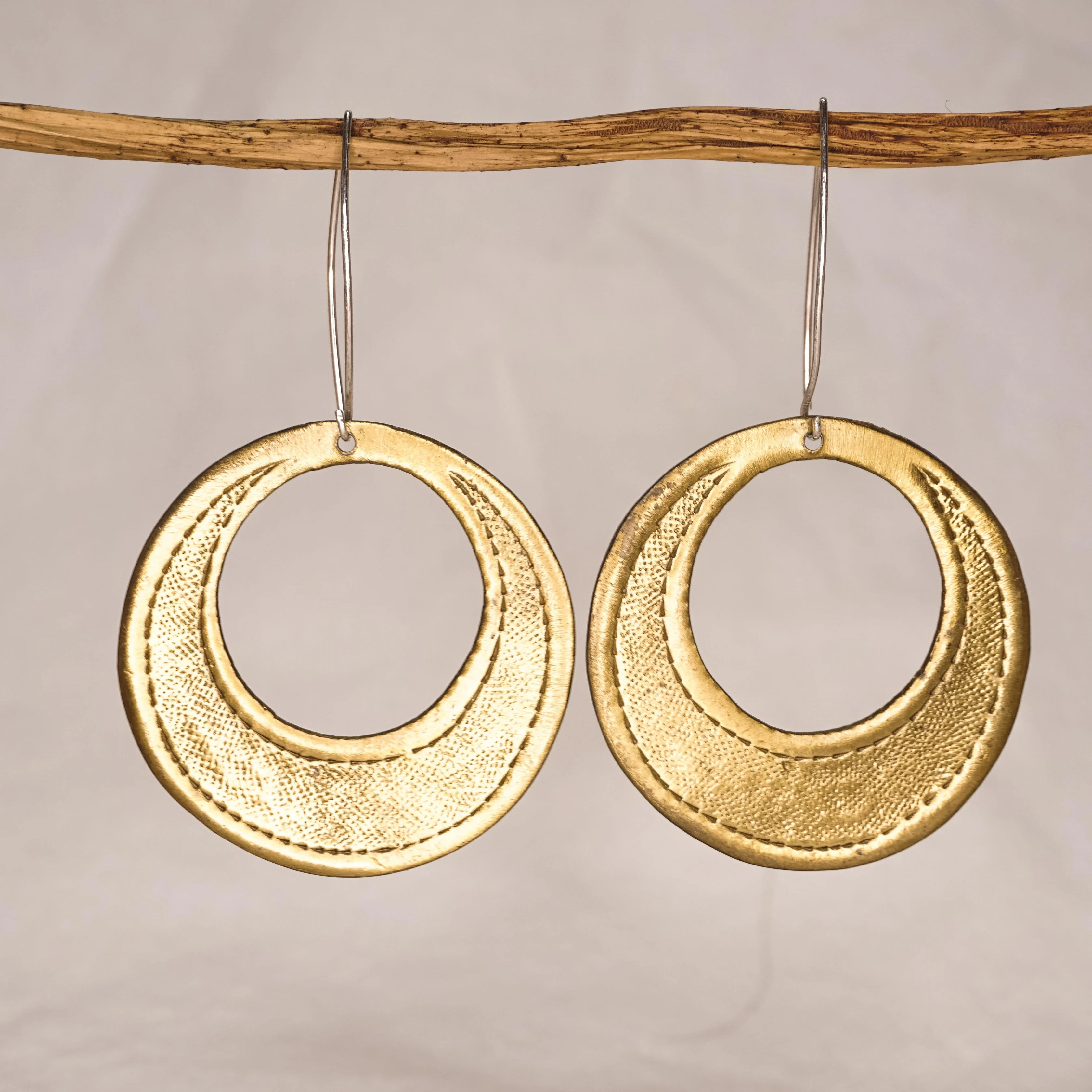 Bề mặt được chạm thủ công với hiệu ứng ánh sáng loang nhẹ, mỗi vòng nguyệt đều giữ lại nét độc bản. Ánh vàng dịu không chói loá mà ấm áp, khiến đôi khuyên tai dễ dàng hoà hợp cùng nhiều phong cách. Theo năm tháng, đồng có thể lên patina (màu thời gian), làm đôi khuyên thêm chiều sâu và dấu ấn cá nhân.
