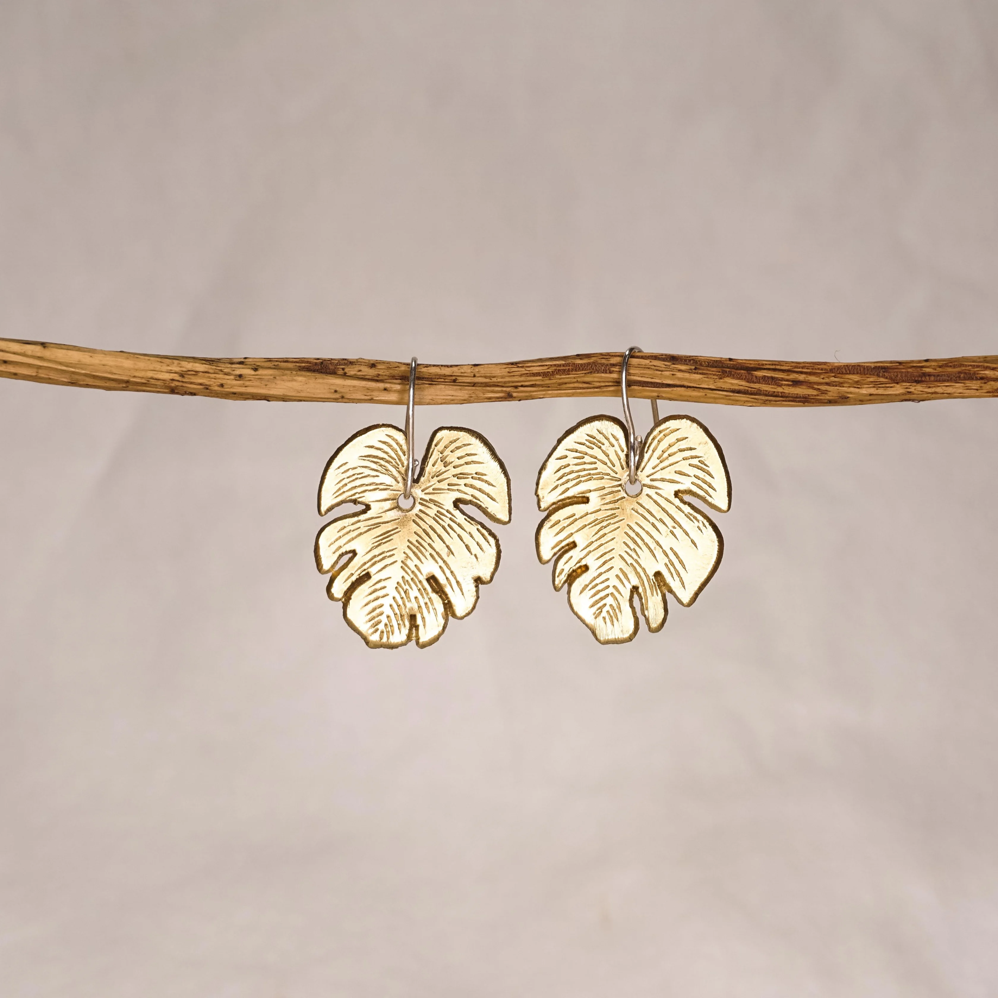 Khuyên tai đồng Lá Monstera nhỏ nhắn, vân khắc thủ công sống động. Dáng lá phóng khoáng, khiến gương mặt sáng lên theo cách vừa tự nhiên, vừa duyên dáng.