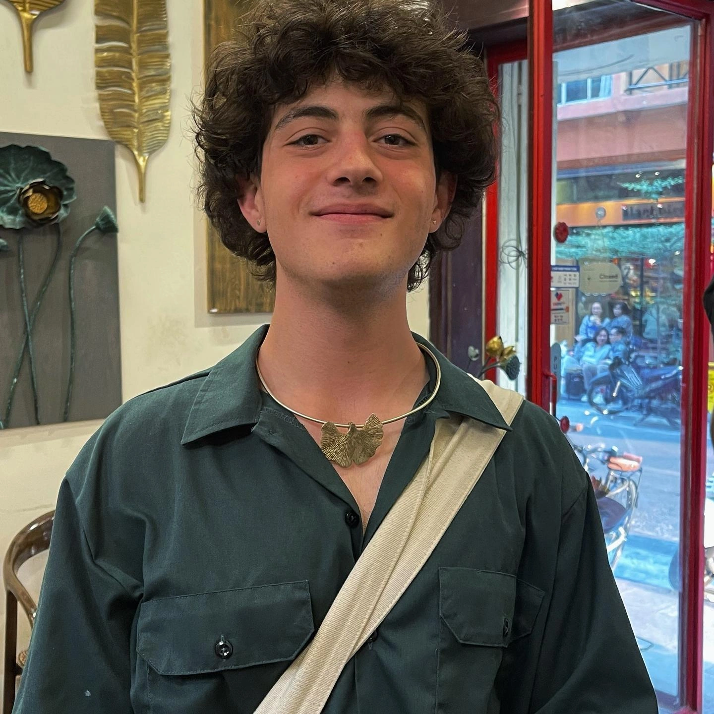 Có những món đồ sinh ra để đứng giữa hai thế giới: một bên là vẻ thanh tao của lụa, của những đường may đo chỉn chu; bên kia là sự tự do của chất liệu thô, là bước chân rộn ràng nơi góc phố rực sáng. Kiềng đồng Ginkgo chính là vậy. Lá bạch quả, loài cây sống nghìn năm, được chắt lọc thành mặt kiềng đối xứng; mỗi gân lá đều do tay người thợ gò, chạm, vuốt cho đến khi ánh đồng vàng dịu—không chói mắt mà ấm như nắng muộn. Trên cổ áo dài, chiếc lá ngả mình trang trọng; trên cổ một chàng trai Âu khoác sơ mi xanh rêu, nó lại trở nên khoáng đạt, có chút lãng du, như một kỷ niệm mang theo từ một chuyến đi xa.
