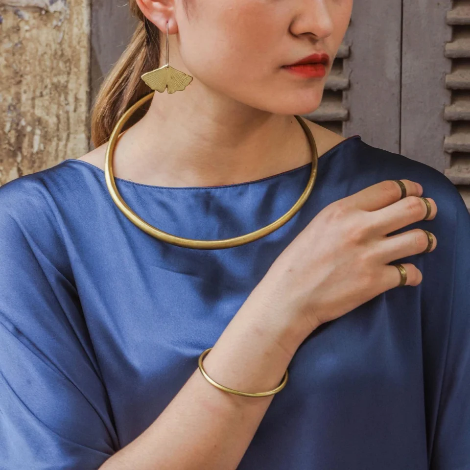 Chiếc Kiềng đồng Lá cúc dài là lựa chọn trang trọng, mang trong mình hơi thở làng nghề xưa nhưng đủ tinh tế để đồng hành cùng phong cách hiện đại. Một chi tiết nhỏ, nhưng đủ khiến bộ trang phục bừng sáng.