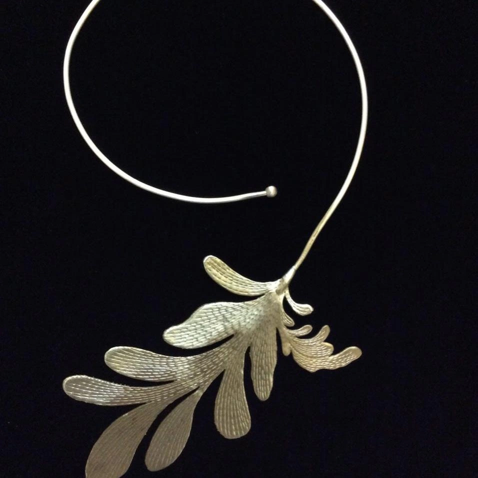 Kiềng đồng Lá cúc dài dáng vòng ôm cổ, cụm lá vươn mềm mại. Thủ công tinh xảo, ánh đồng trầm gợi sự bền bỉ và sang trọng – rất được ưa chuộng trong sự kiện, bản tin truyền hình.