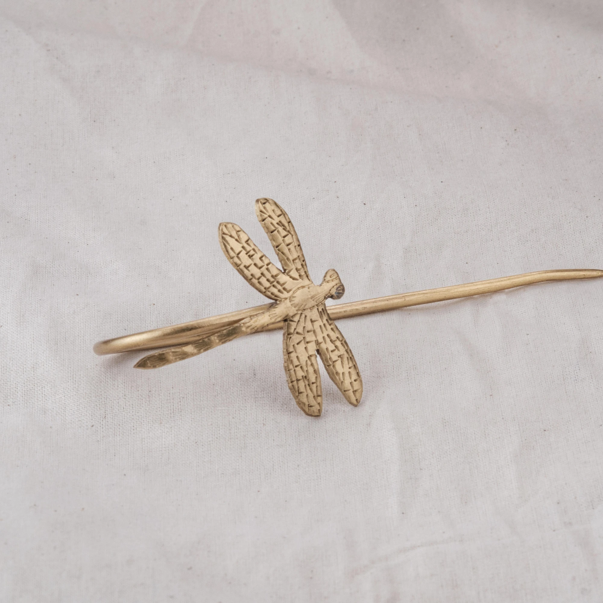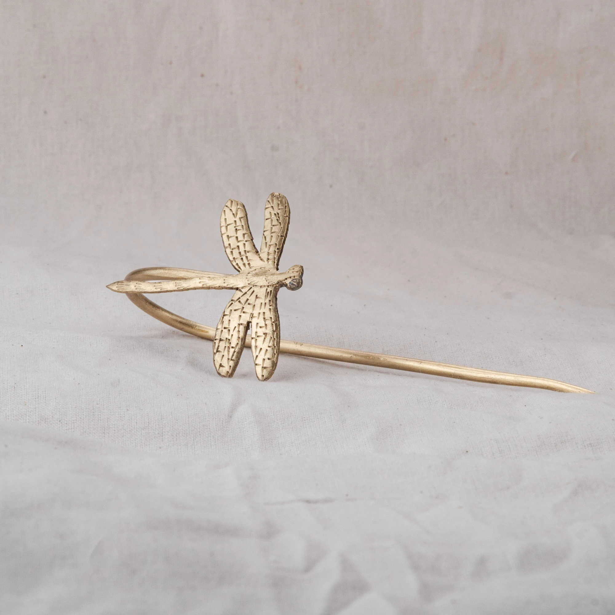 Trâm chuồn chuồn với bốn cánh mảnh khắc sống động, thân trâm cong giữ tóc chắc gọn. Cài trên búi tóc, trâm như một chú chuồn chuồn đậu hờ, gợi nhắc mùa hạ xưa và khát vọng tự do bay bổng.
