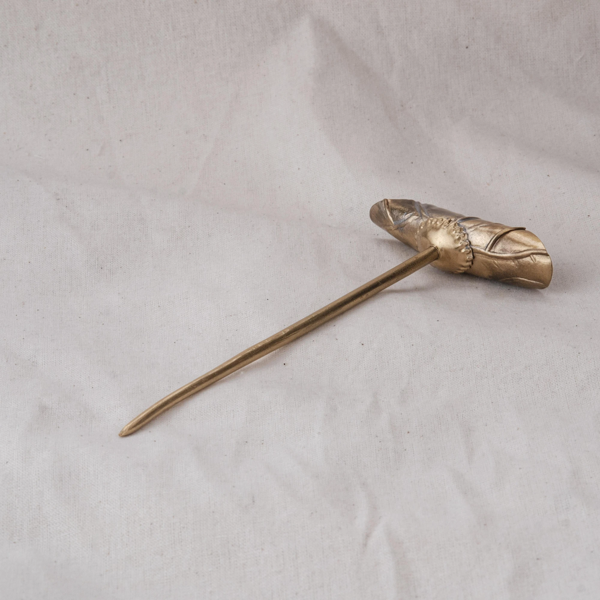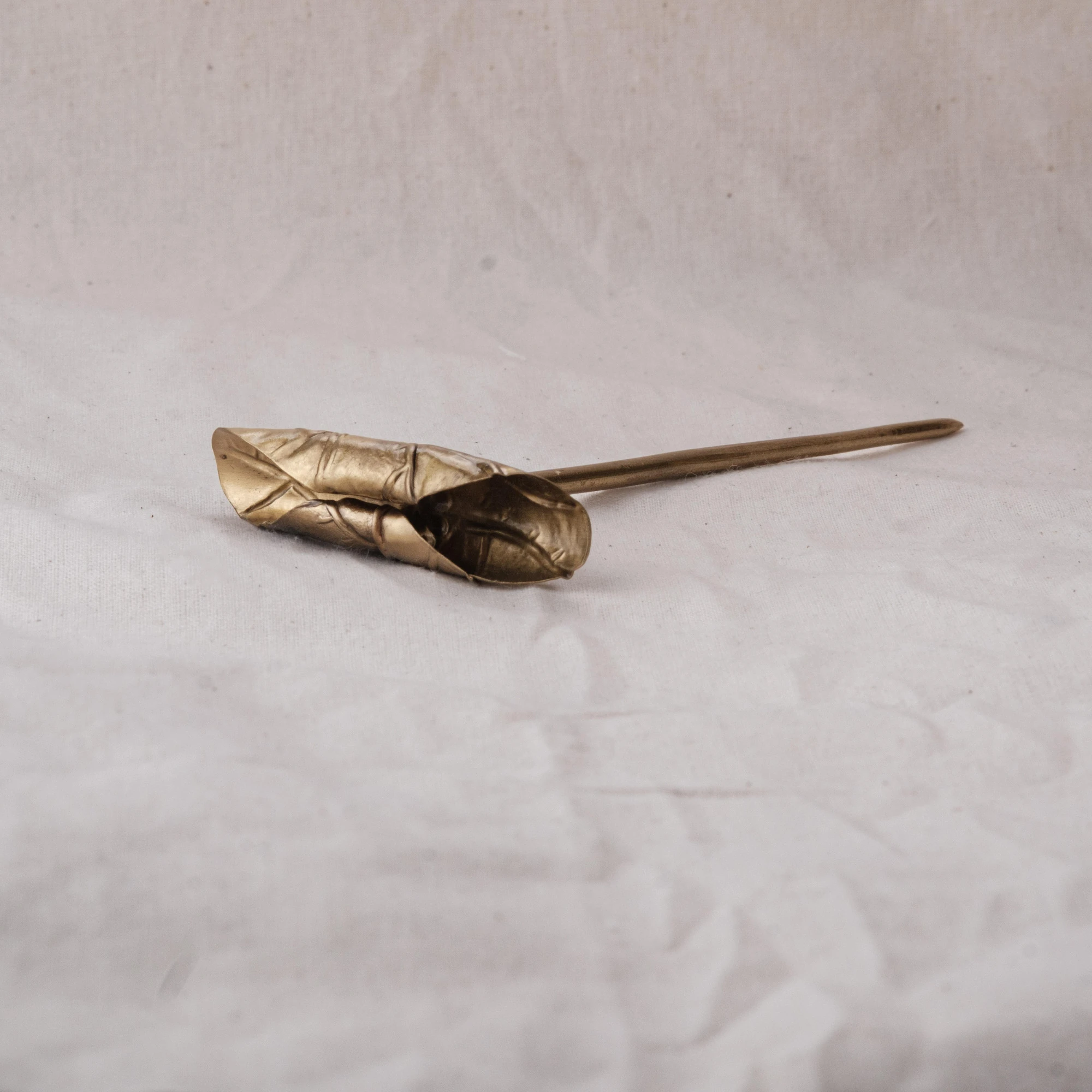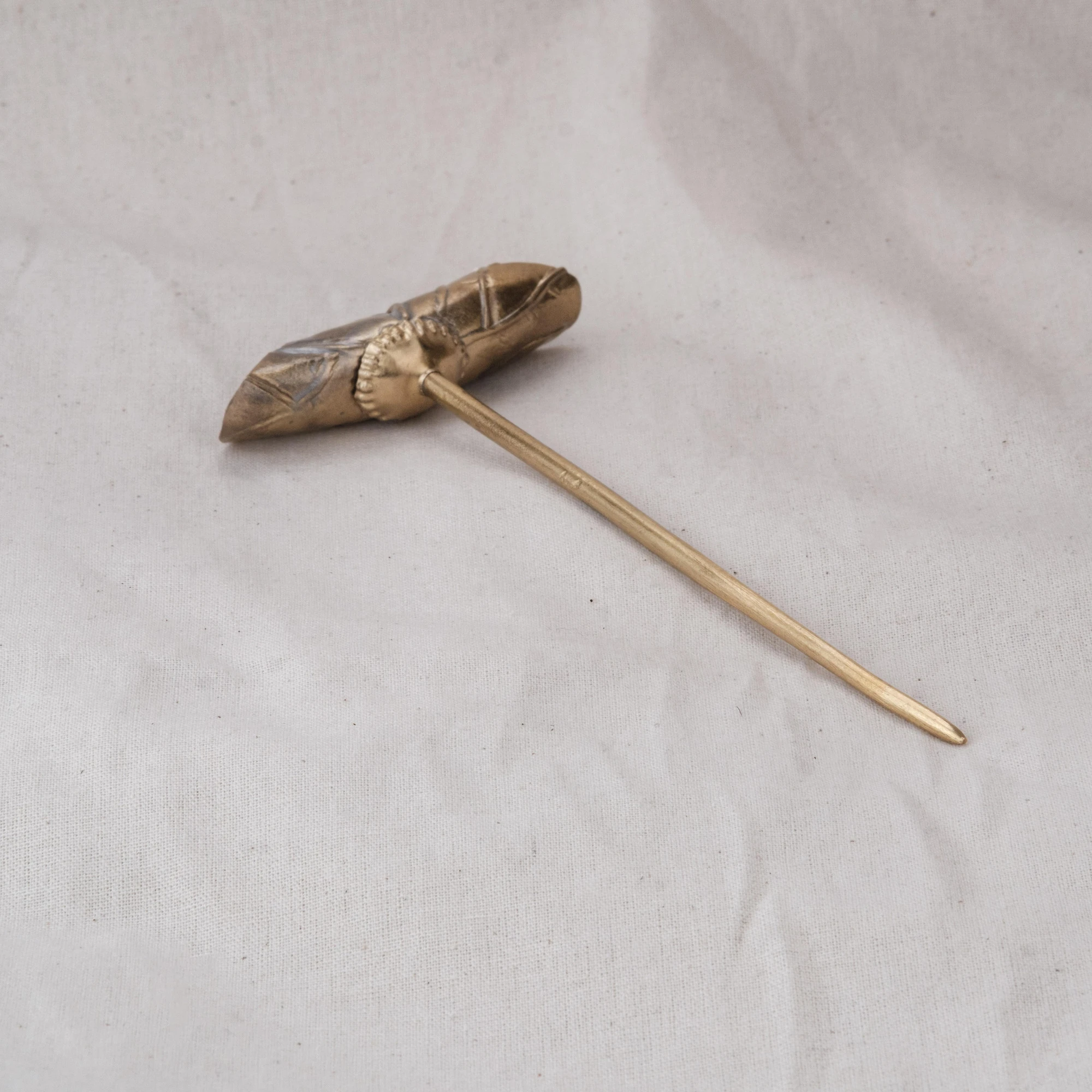 Trâm đồng Lá Sen Non được gò thủ công từ đồng thau, giữ nguyên dáng lá vừa hé, còn cuộn mình e ấp. Khi cài trên tóc, trâm như một lời thủ thỉ: tuổi trẻ có thể mong manh, nhưng luôn căng đầy nhựa sống, như giọt sương ban mai trên mặt hồ yên ả.