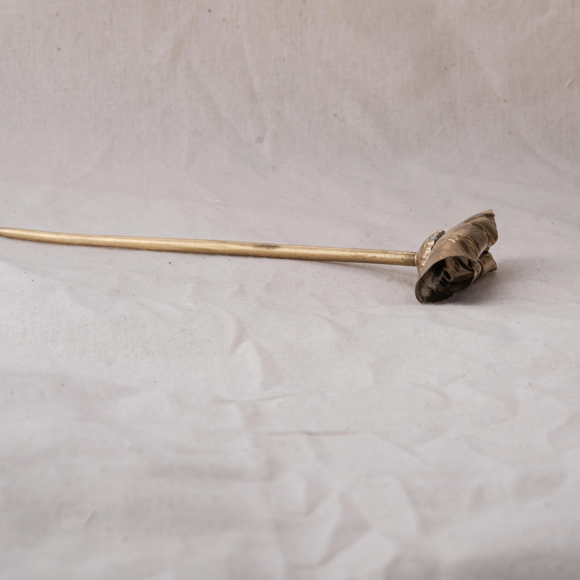 Chế tác từ đồng thau với sắc vàng dịu, bề mặt đánh xước để giữ sự trầm ấm. Theo thời gian, trâm có thể lên patina (màu thời gian), tạo chiều sâu và vẻ cổ kính. Chúng tôi dùng ngôn ngữ an toàn: sản phẩm hạn chế kích ứng và sẽ chậm xỉn nếu chăm đúng.