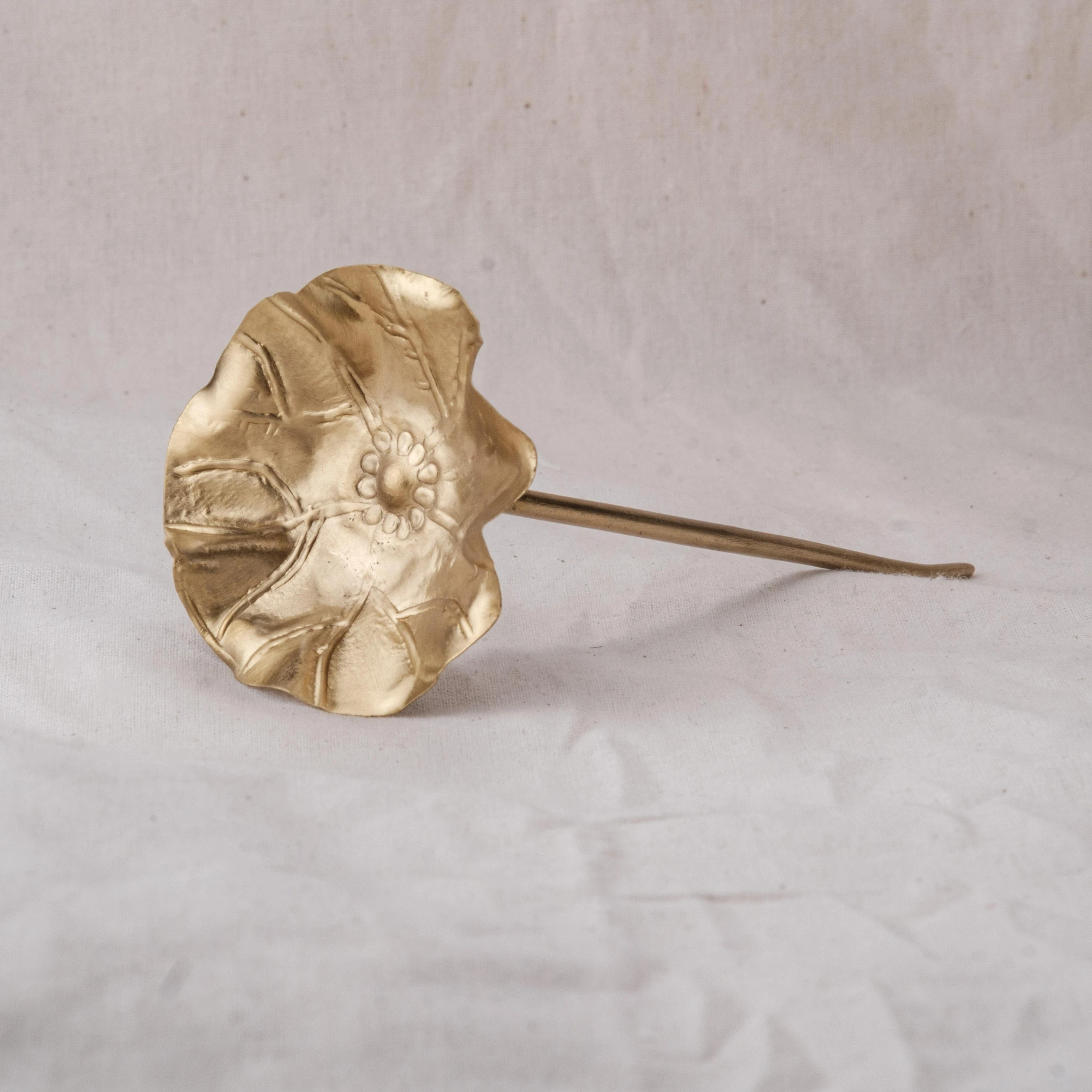 Chiếc trâm được làm từ đồng thau (brass), sắc vàng dịu, dễ bắt sáng nhưng không chói. Bề mặt được đánh xước mịn, giữ vẻ trầm ấm. Qua năm tháng, trâm có thể lên patina (màu thời gian), khiến lá sen đồng càng thêm chiều sâu, như lá thật đã đi qua mùa gió.