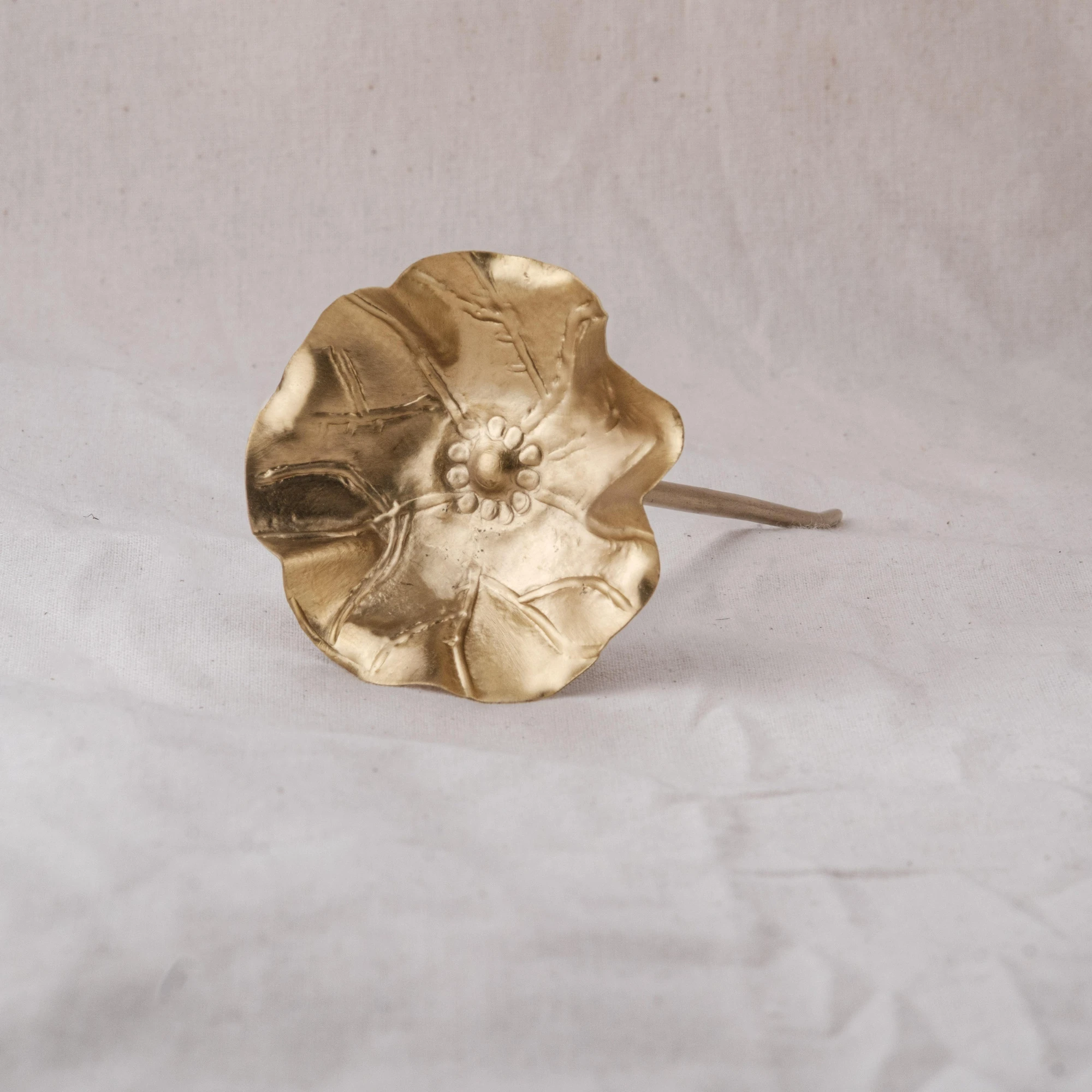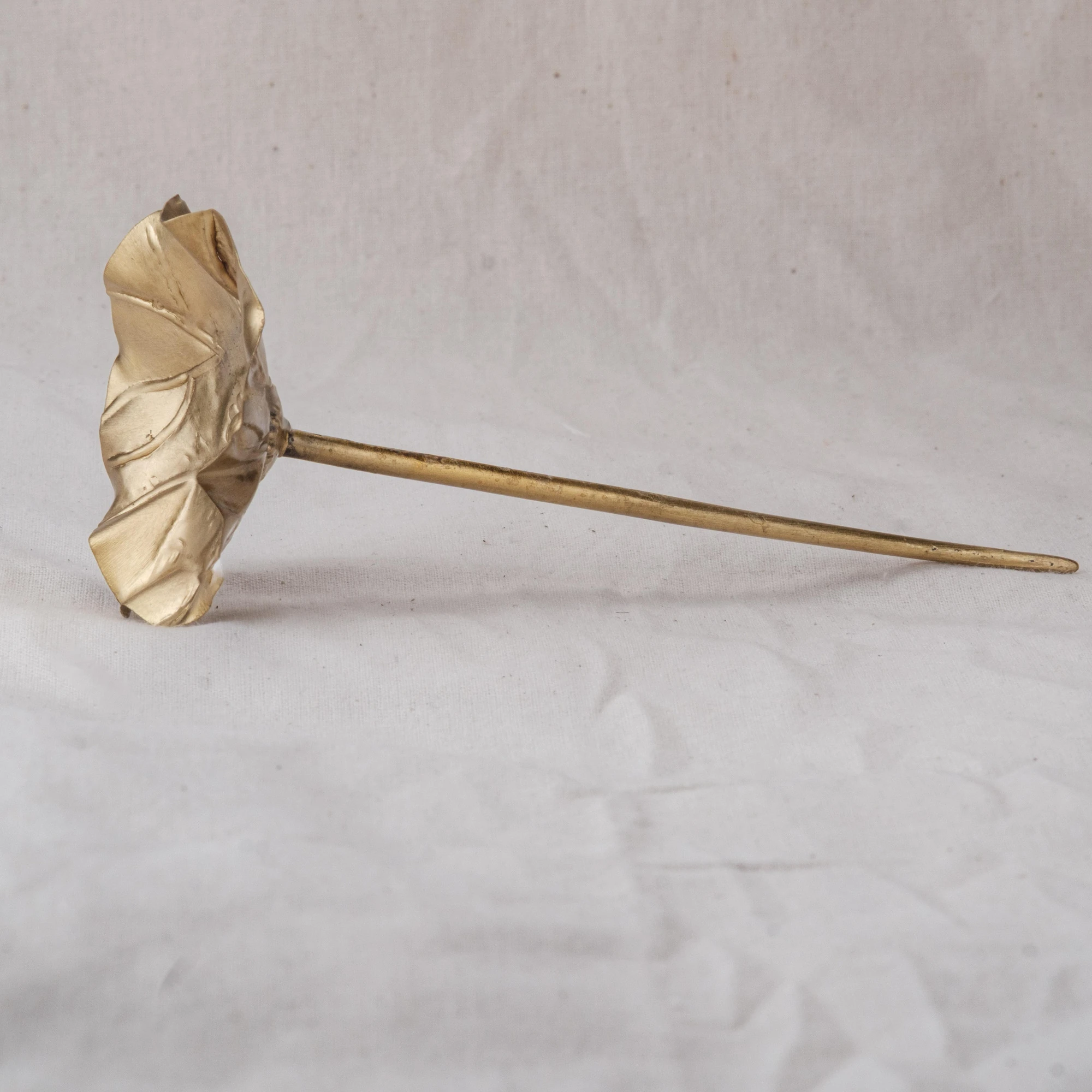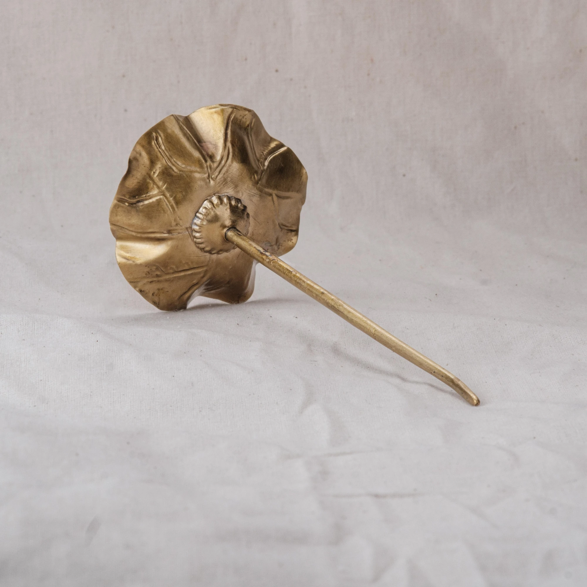 Trâm đồng Lá Sen gò thủ công từ đồng thau, giữ nguyên nếp gân và mép lượn mềm của lá sen. Khi cài trên tóc, trâm không chỉ là phụ kiện mà còn như một lời nhắc nhở dịu dàng: hãy sống an nhiên, rộng lòng, như chiếc lá sen nâng đỡ cả hồ nước mùa hạ.