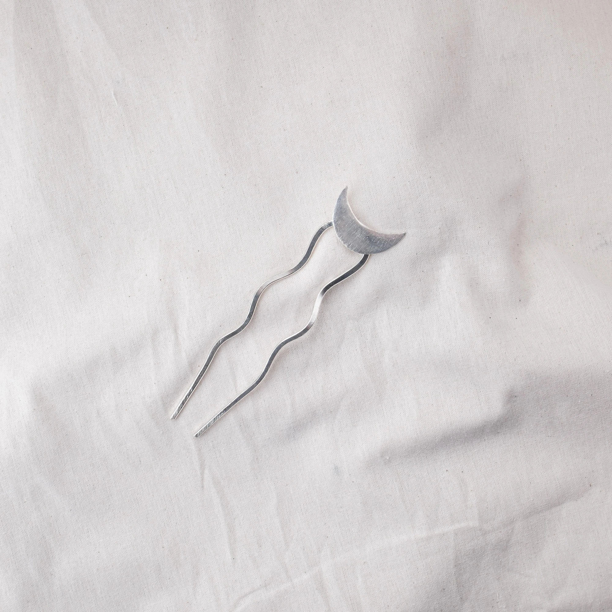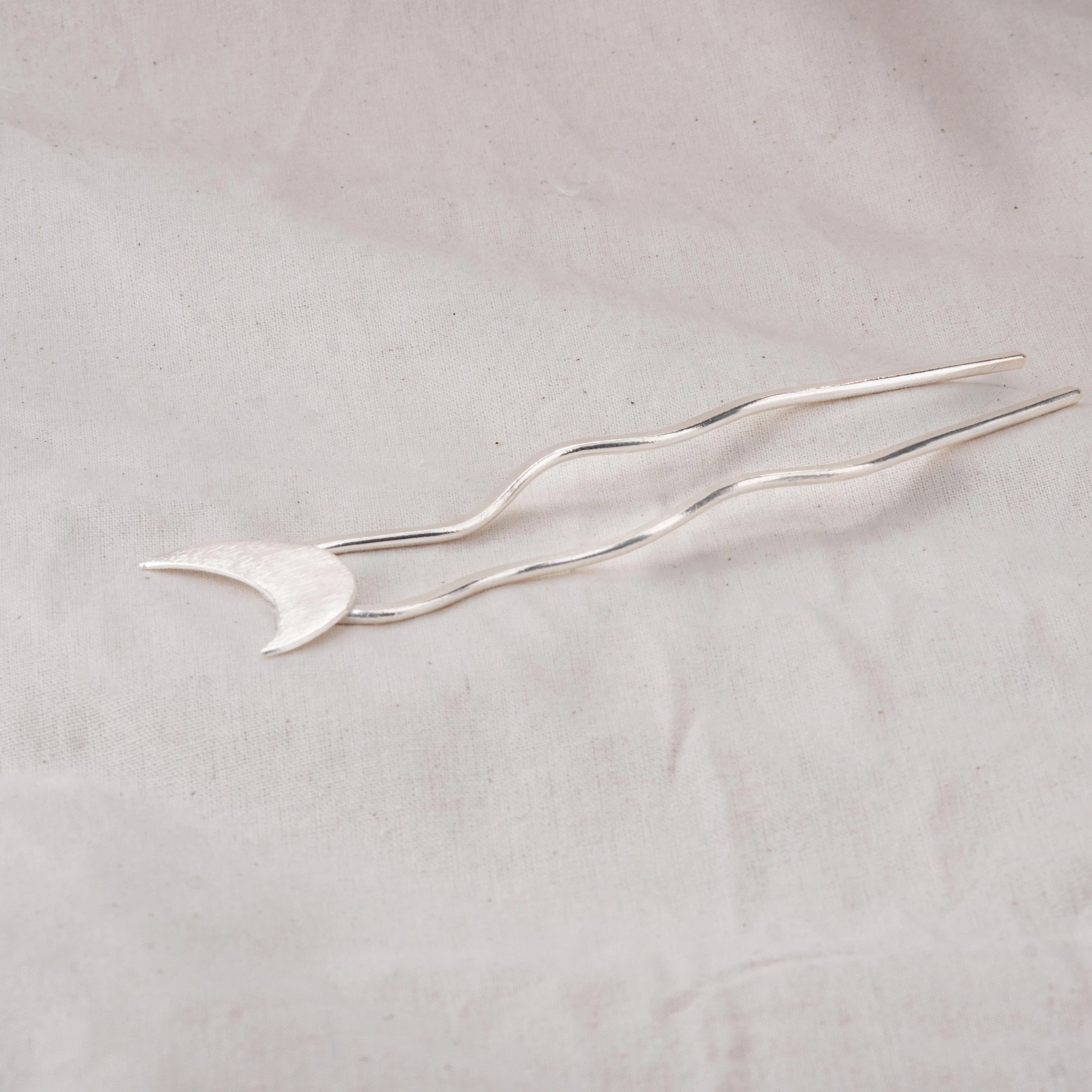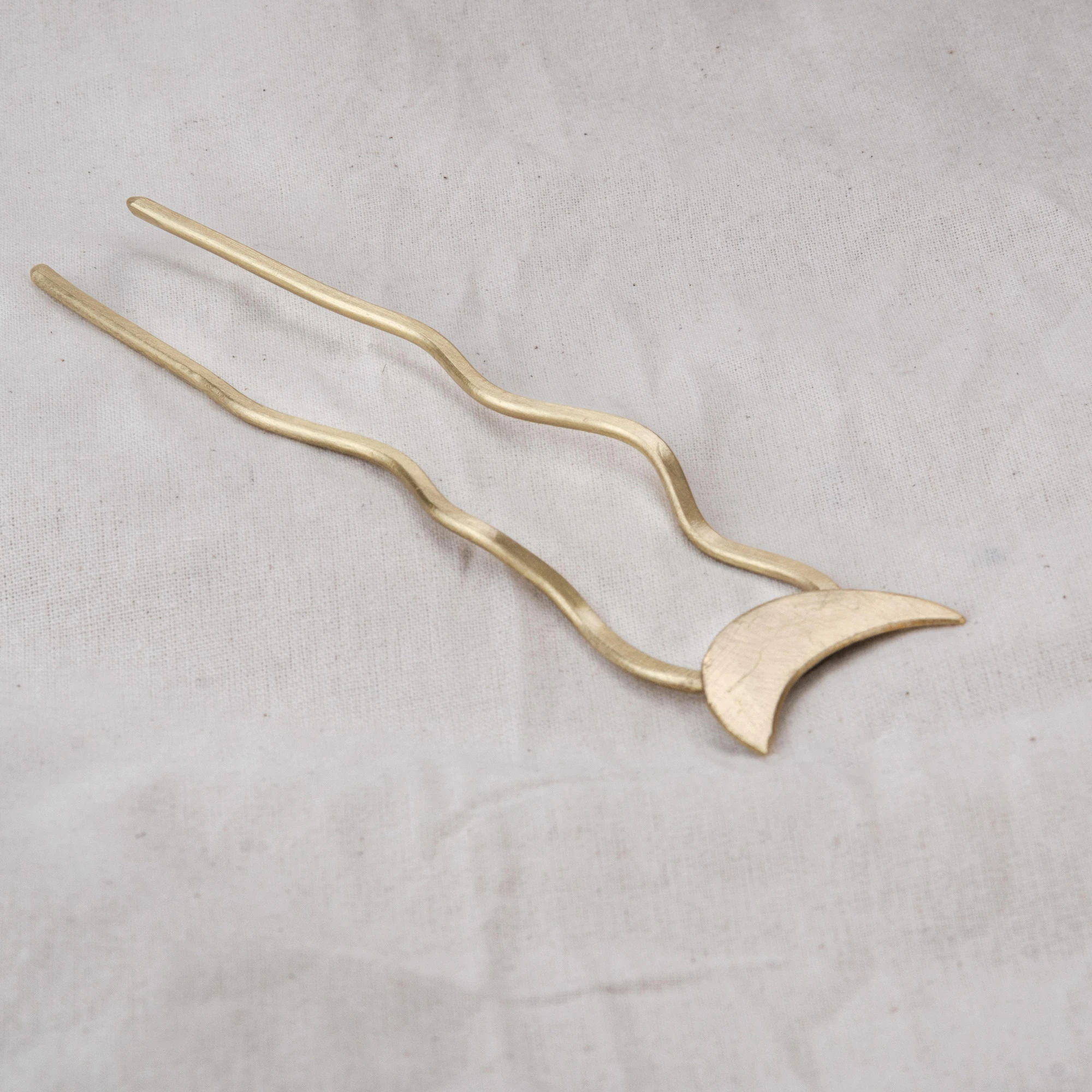 Trâm mặt trăng với hai nhánh uốn lượn mềm, đầu trâm là vệt bán nguyệt cong. Cài trên tóc, trâm như một ánh trăng nhỏ, giữ tóc gọn mà vẫn toả ra vẻ duyên dáng bí ẩn.