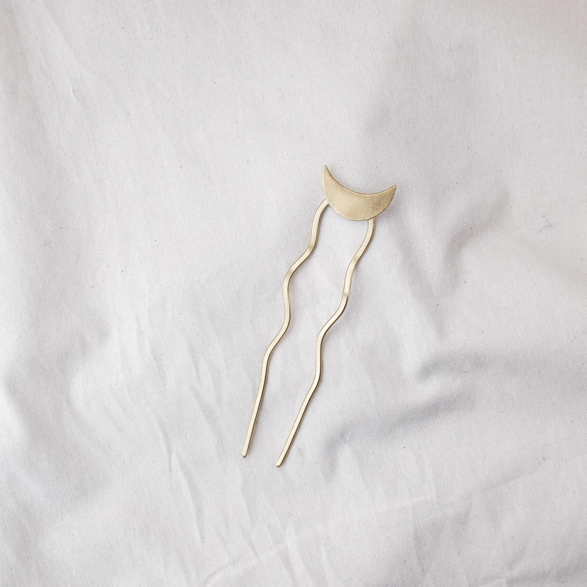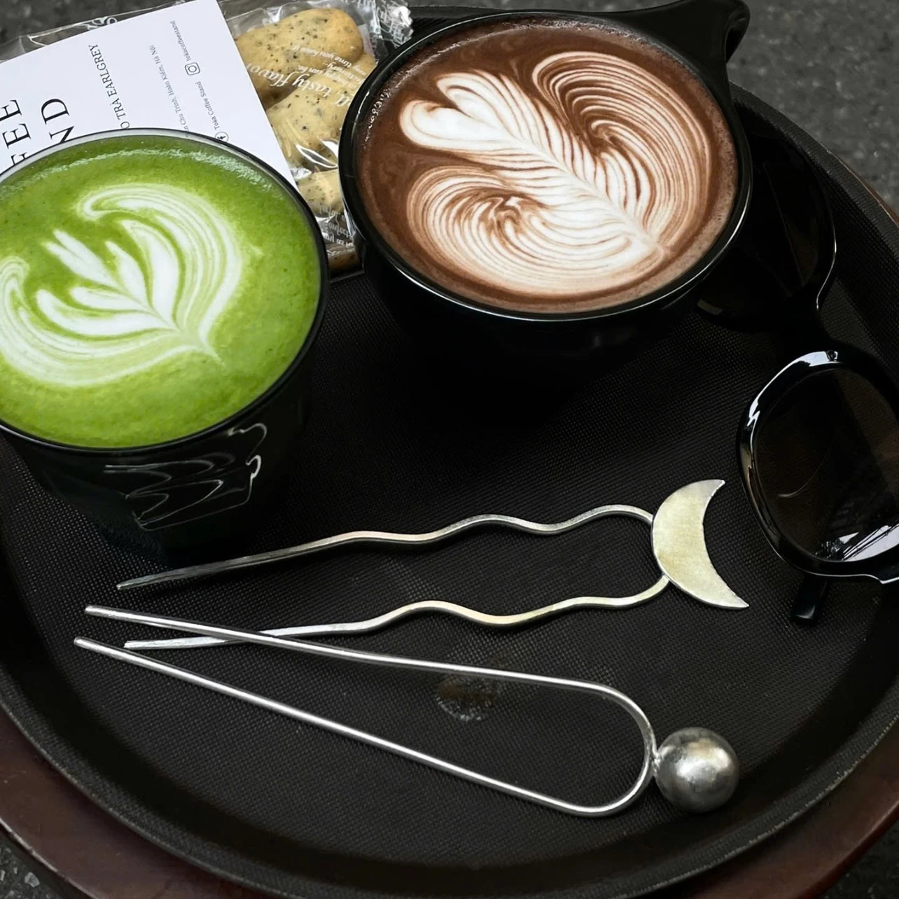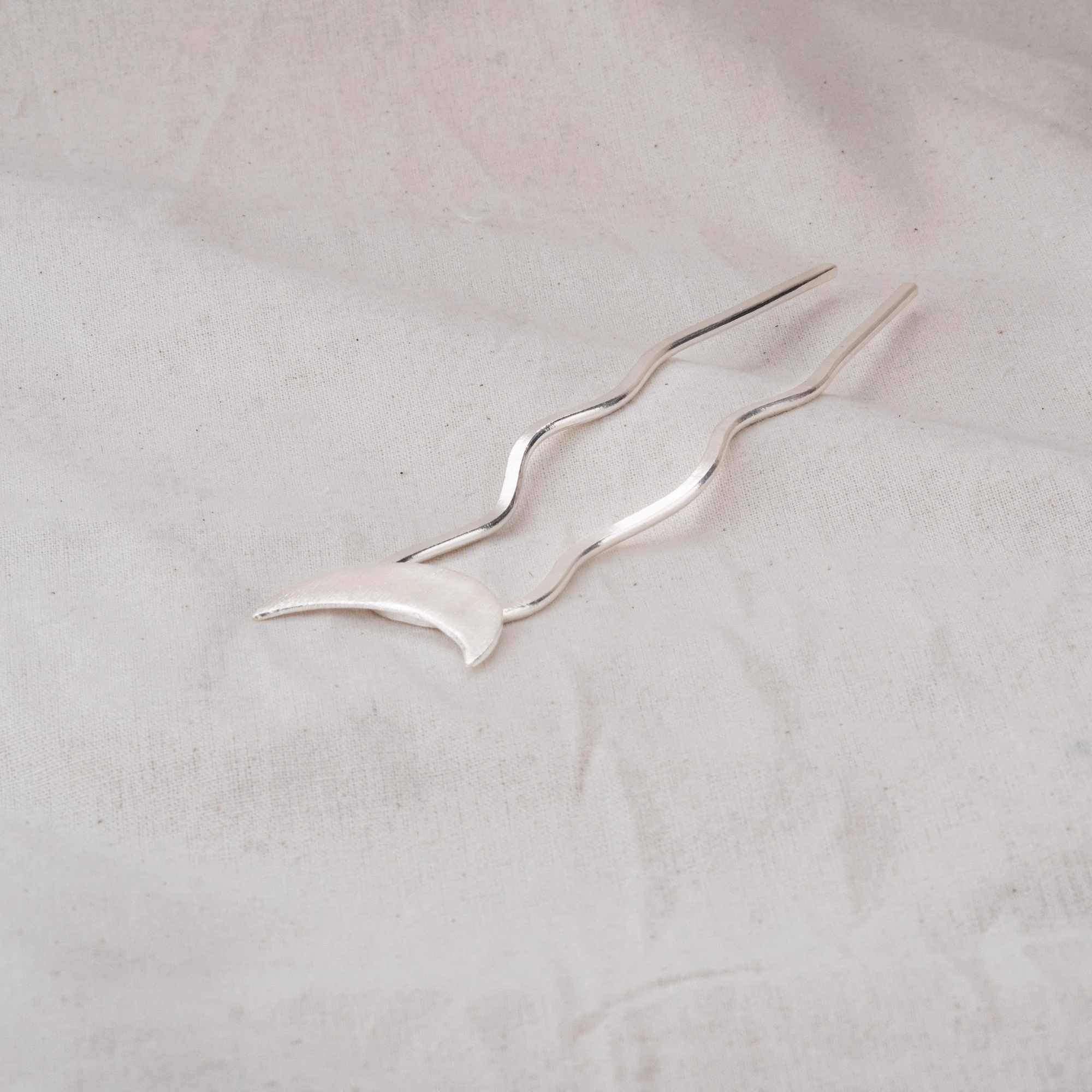 Trâm mặt trăng với hai nhánh uốn lượn mềm, đầu trâm là vệt bán nguyệt cong. Cài trên tóc, trâm như một ánh trăng nhỏ, giữ tóc gọn mà vẫn toả ra vẻ duyên dáng bí ẩn.