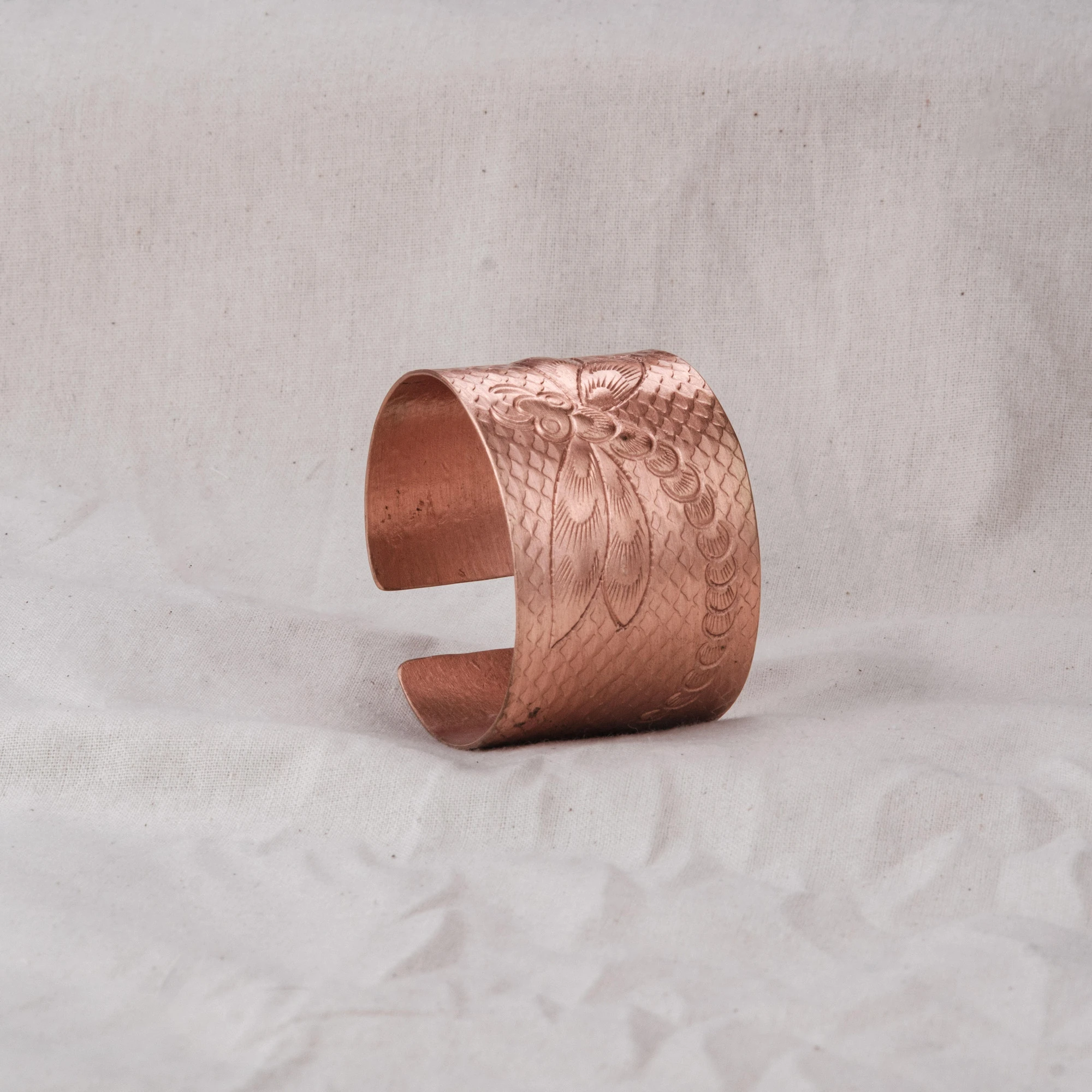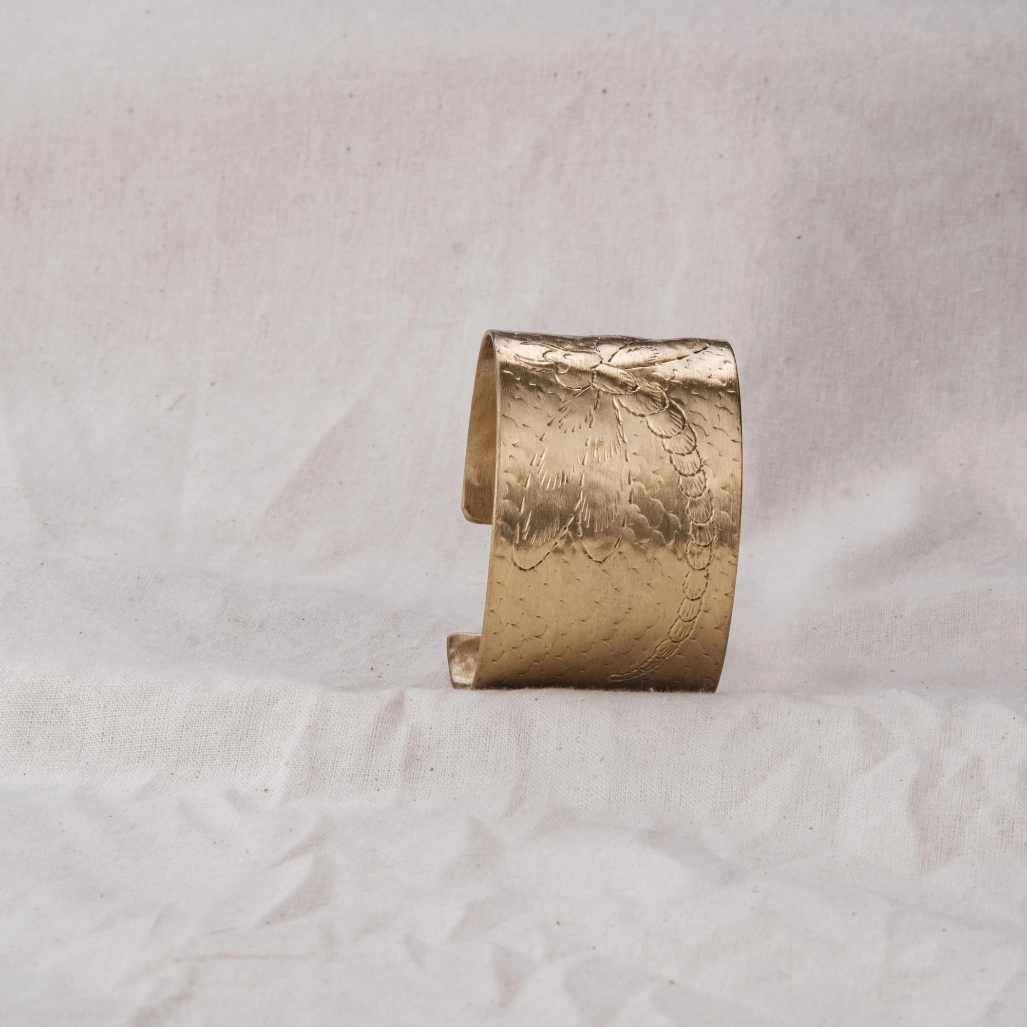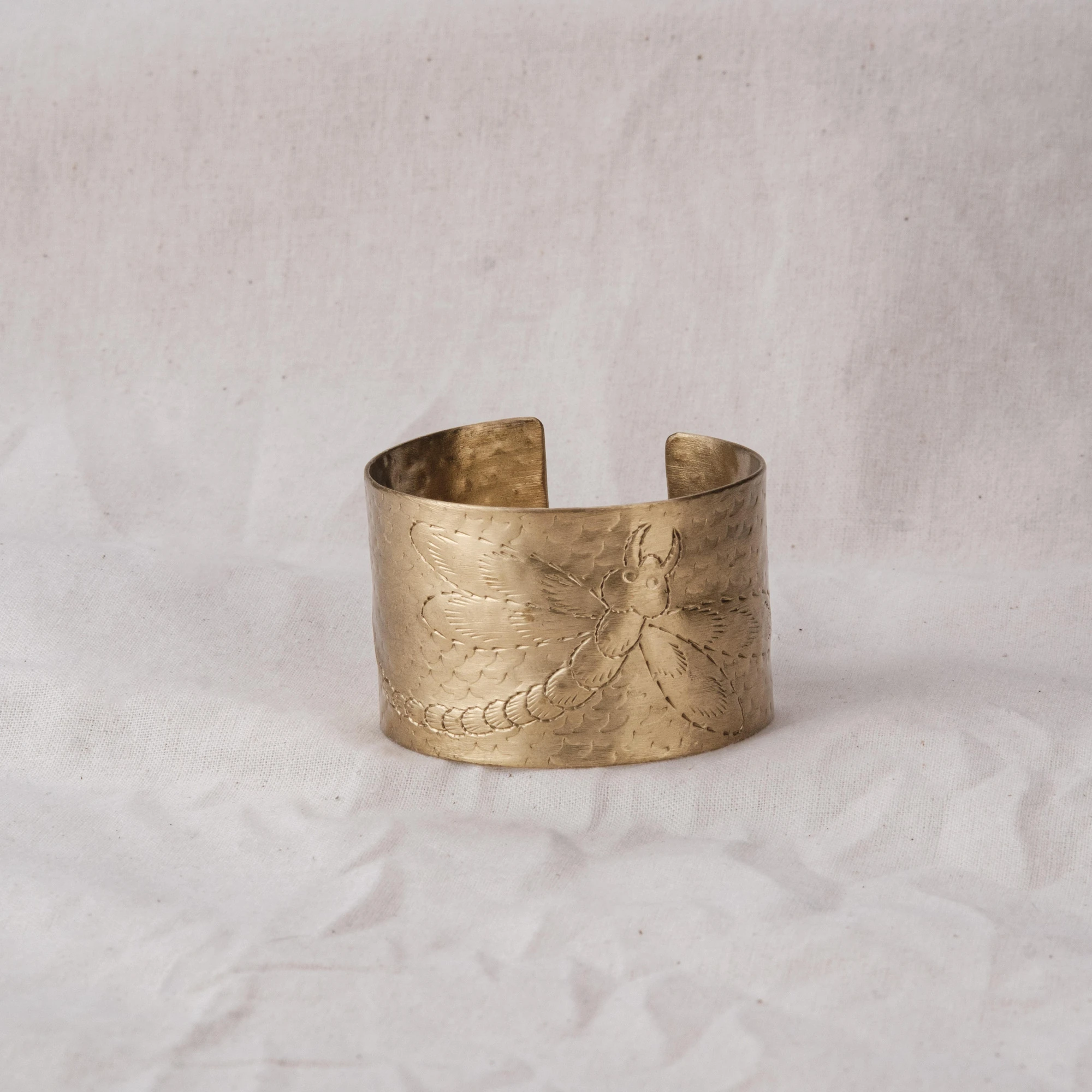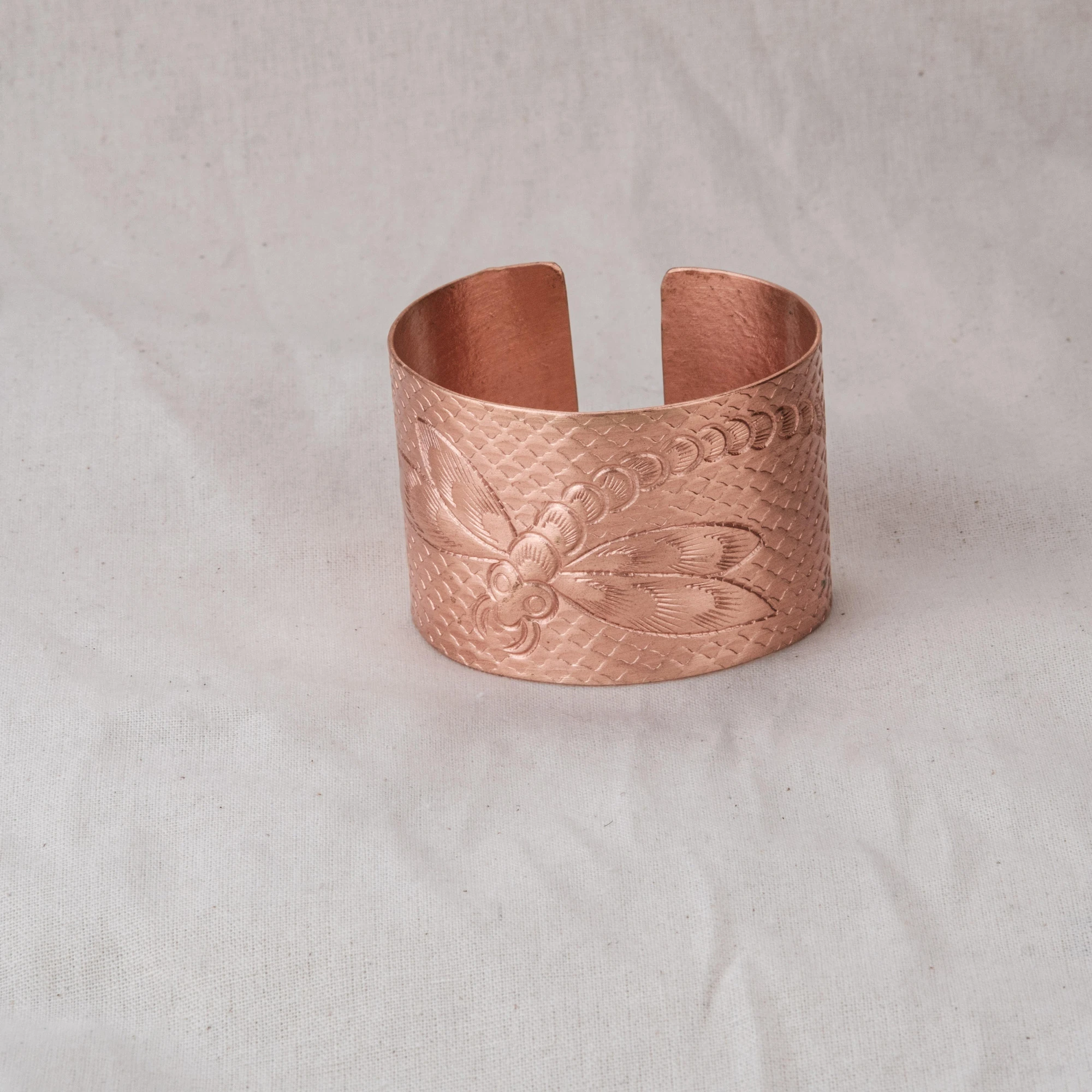 Vòng tay chạm chuồn chuồn bản lớn, bề mặt gõ thủ công, khắc hình chuồn chuồn thanh mảnh. Ba phiên bản: đồng đỏ, đồng thau và mạ bạc – mỗi sắc độ gợi một vẻ đẹp riêng: trầm ấm, sang nhã hay tinh tế.