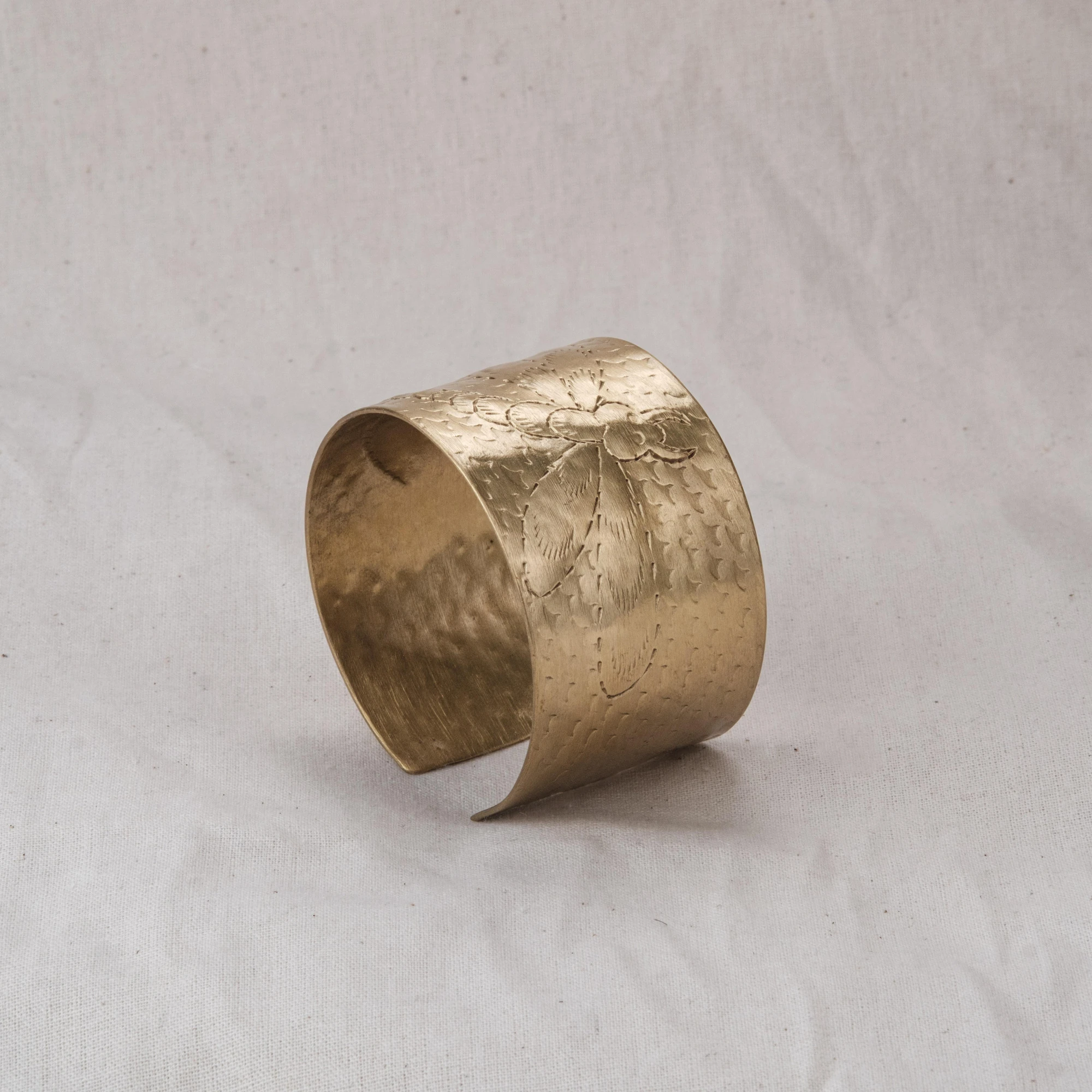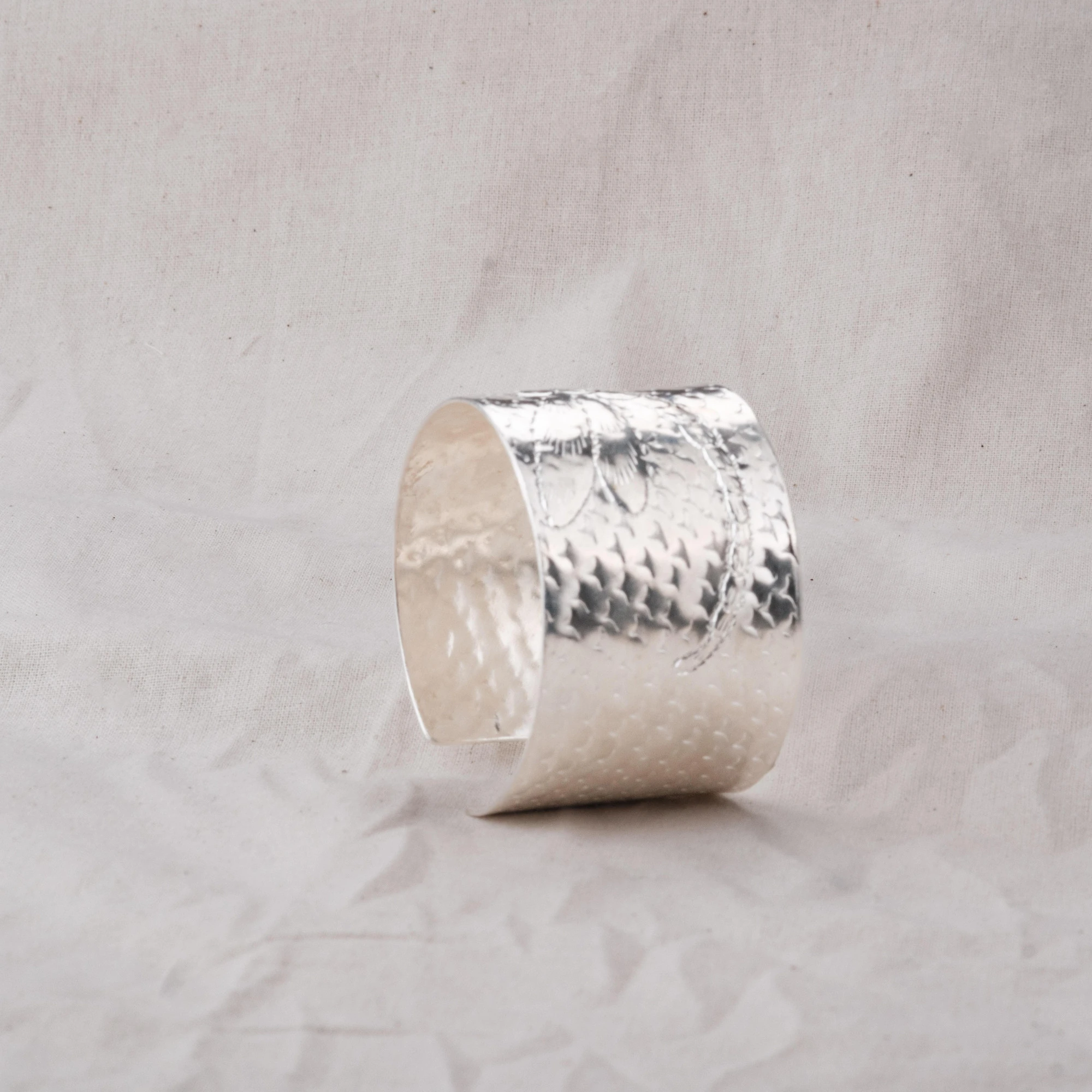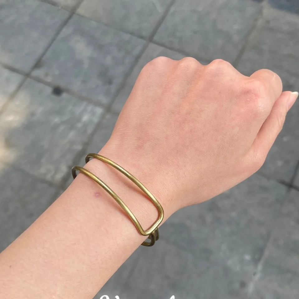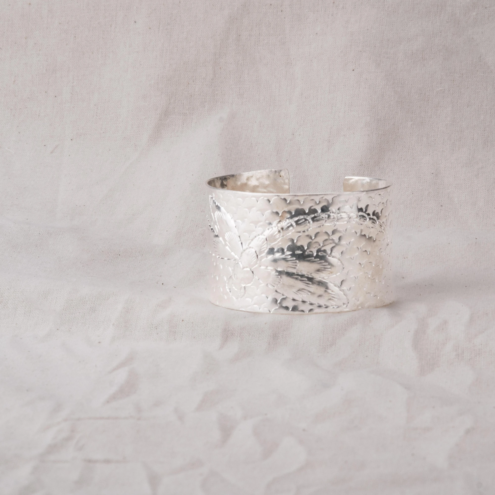 Vòng tay chạm chuồn chuồn bản lớn, bề mặt gõ thủ công, khắc hình chuồn chuồn thanh mảnh. Ba phiên bản: đồng đỏ, đồng thau và mạ bạc – mỗi sắc độ gợi một vẻ đẹp riêng: trầm ấm, sang nhã hay tinh tế.