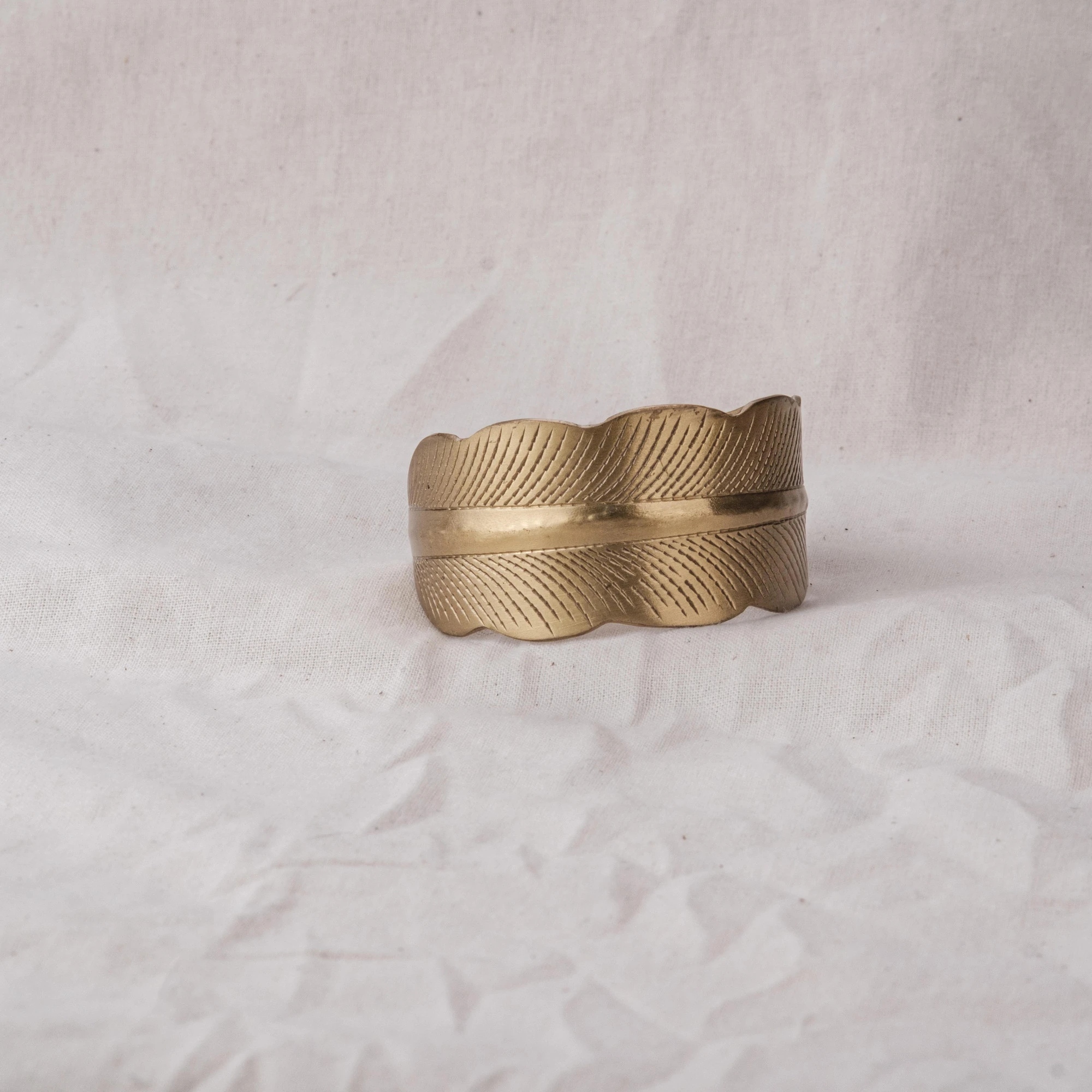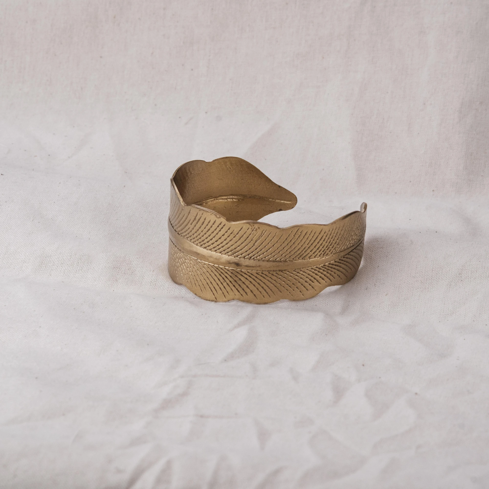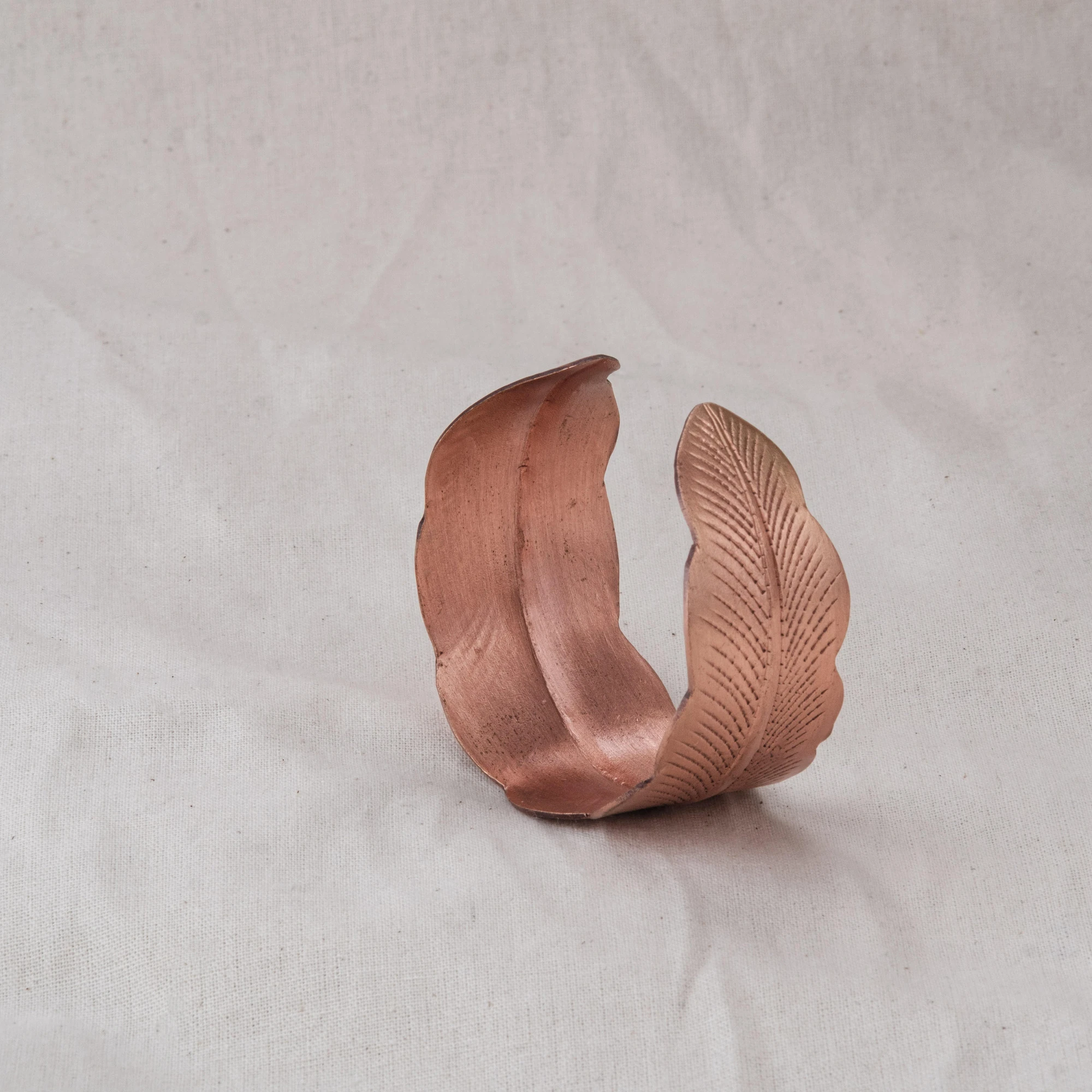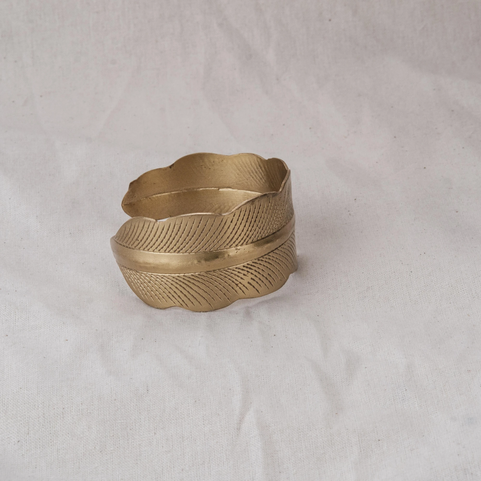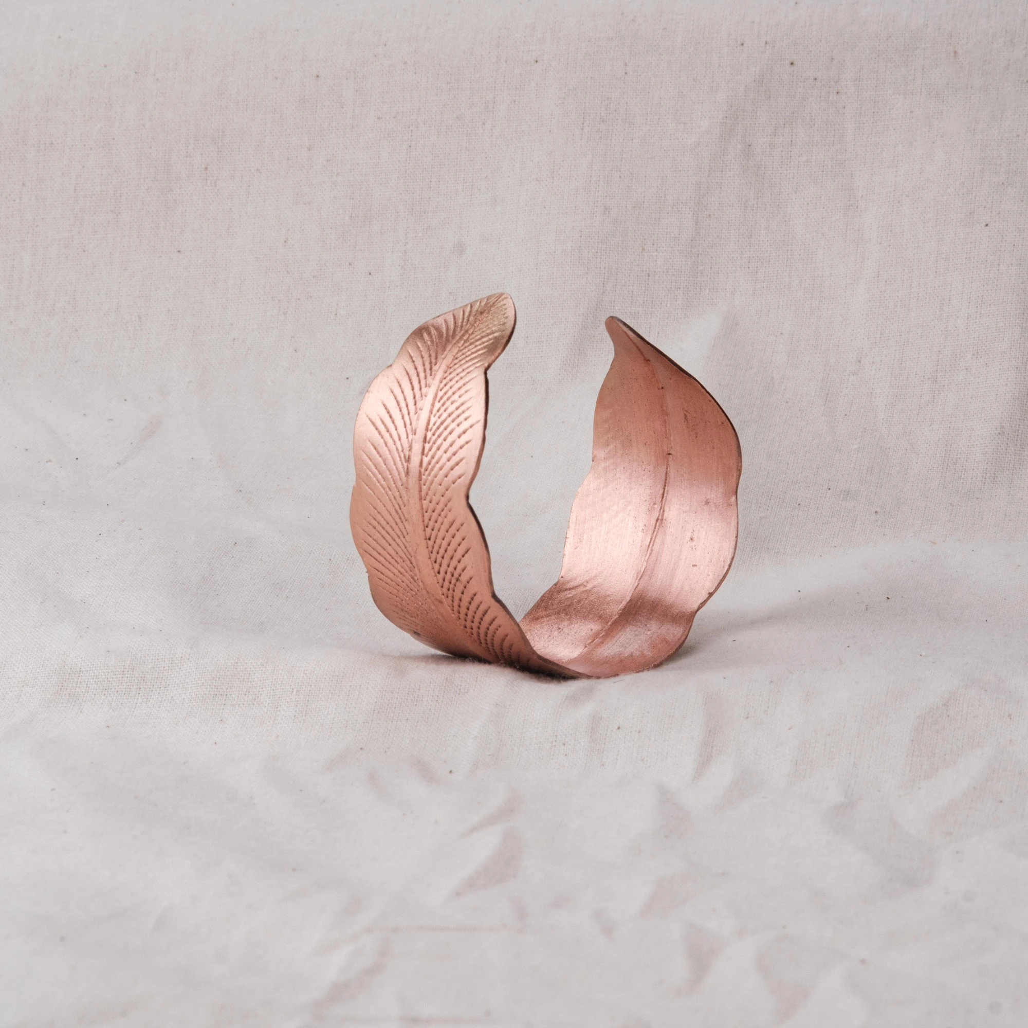 Vòng tay chạm lông vũ khắc thủ công từng đường gân mềm mại. Đeo trên tay, vòng gợi sự tự do, thanh thoát và sang trọng, với ba phiên bản: đồng đỏ, đồng thau và mạ bạc.