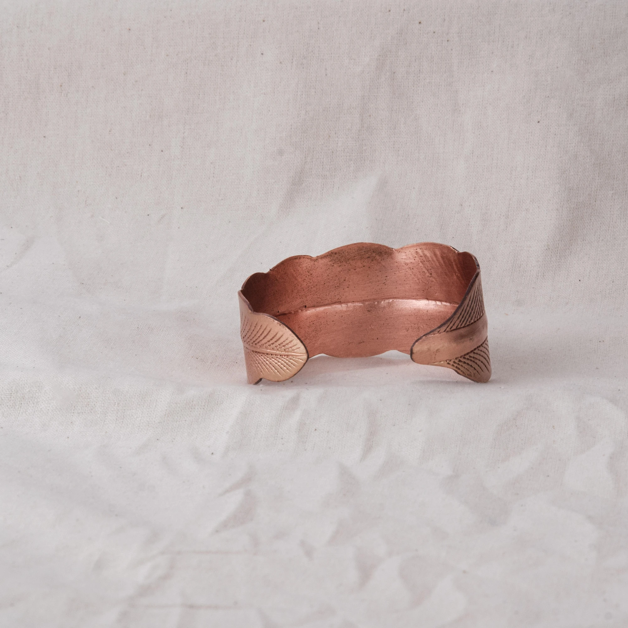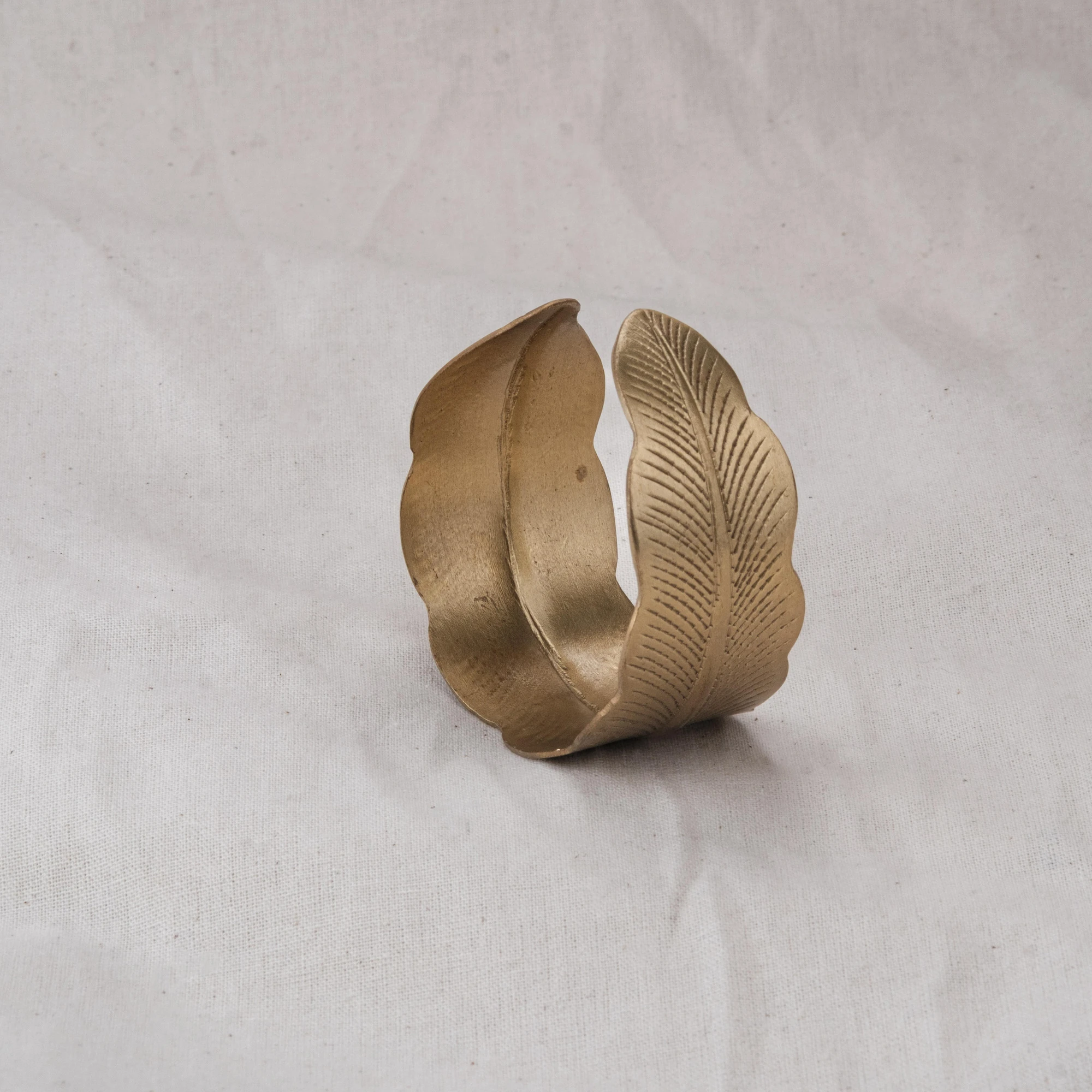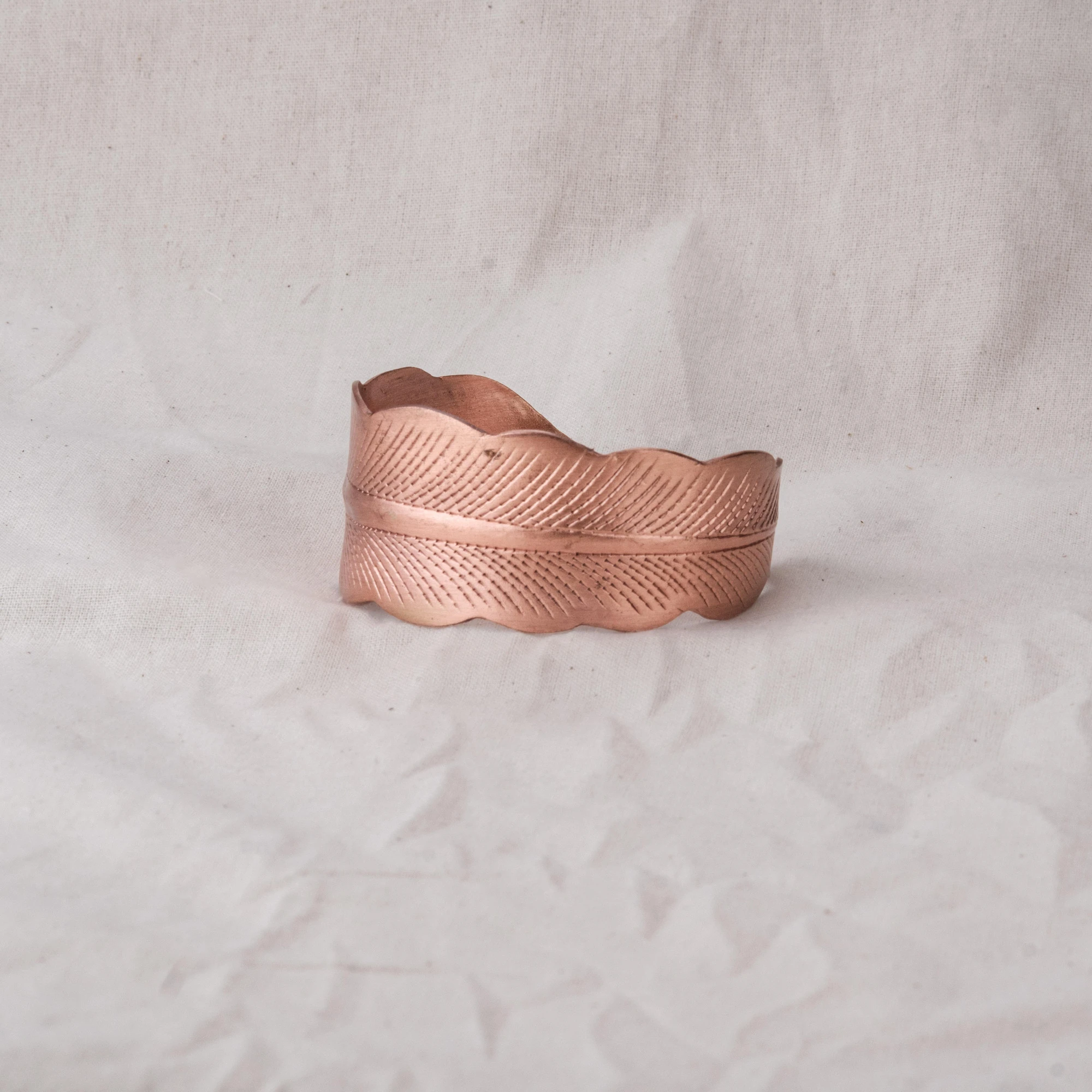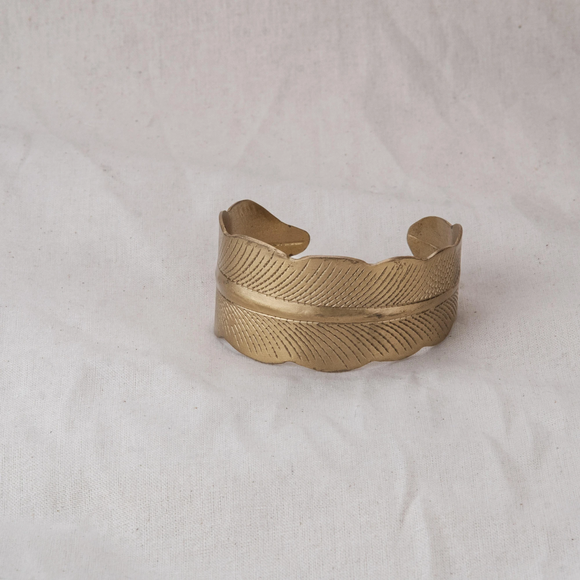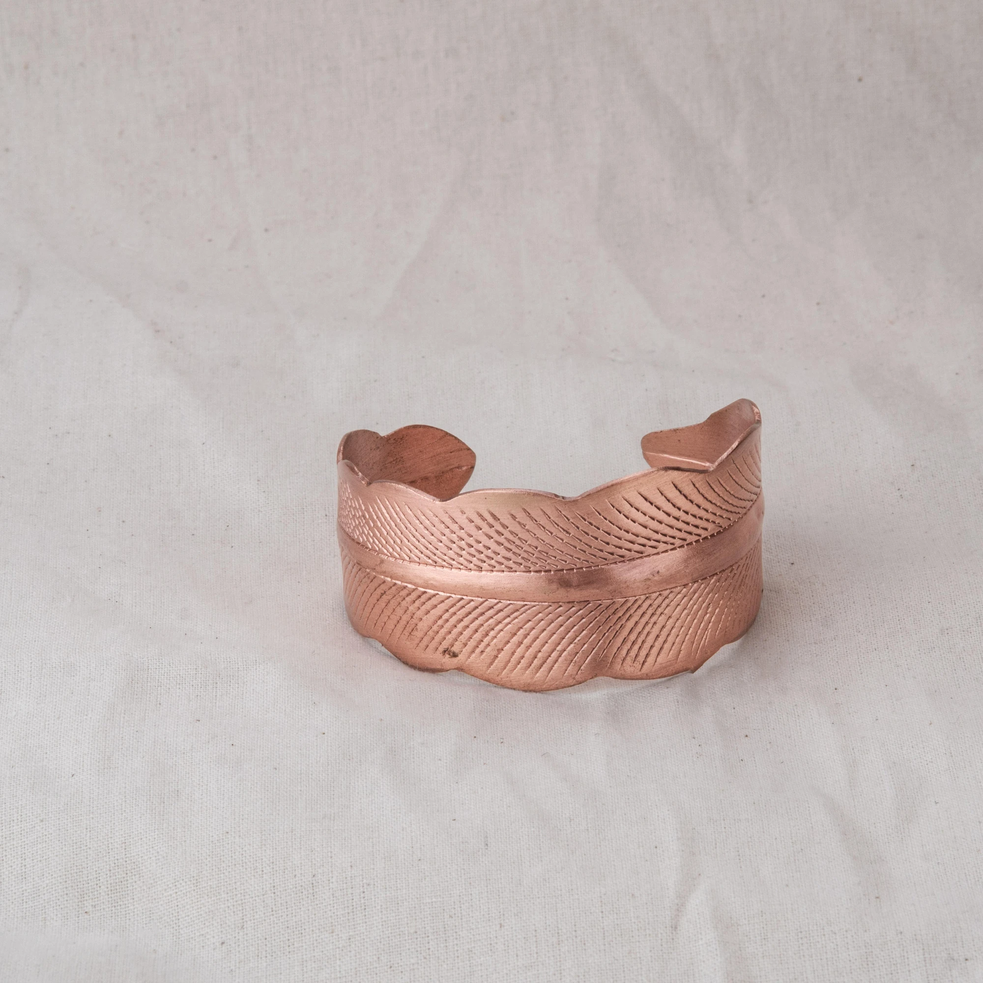 Vòng tay chạm lông vũ khắc thủ công từng đường gân mềm mại. Đeo trên tay, vòng gợi sự tự do, thanh thoát và sang trọng, với ba phiên bản: đồng đỏ, đồng thau và mạ bạc.