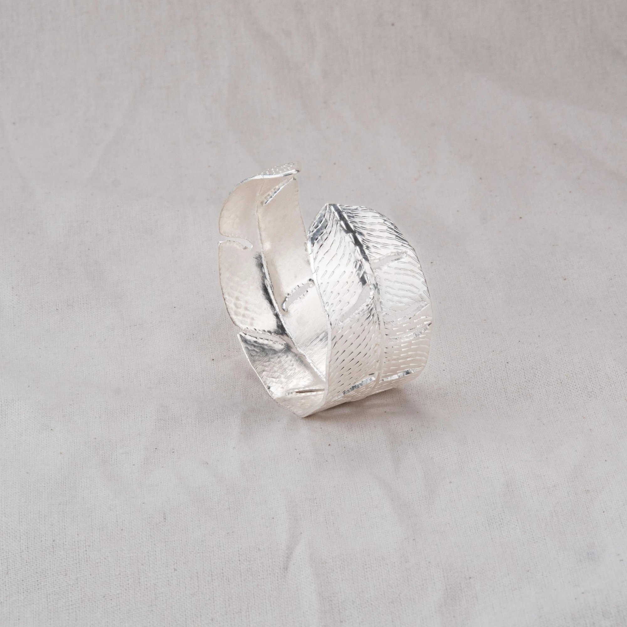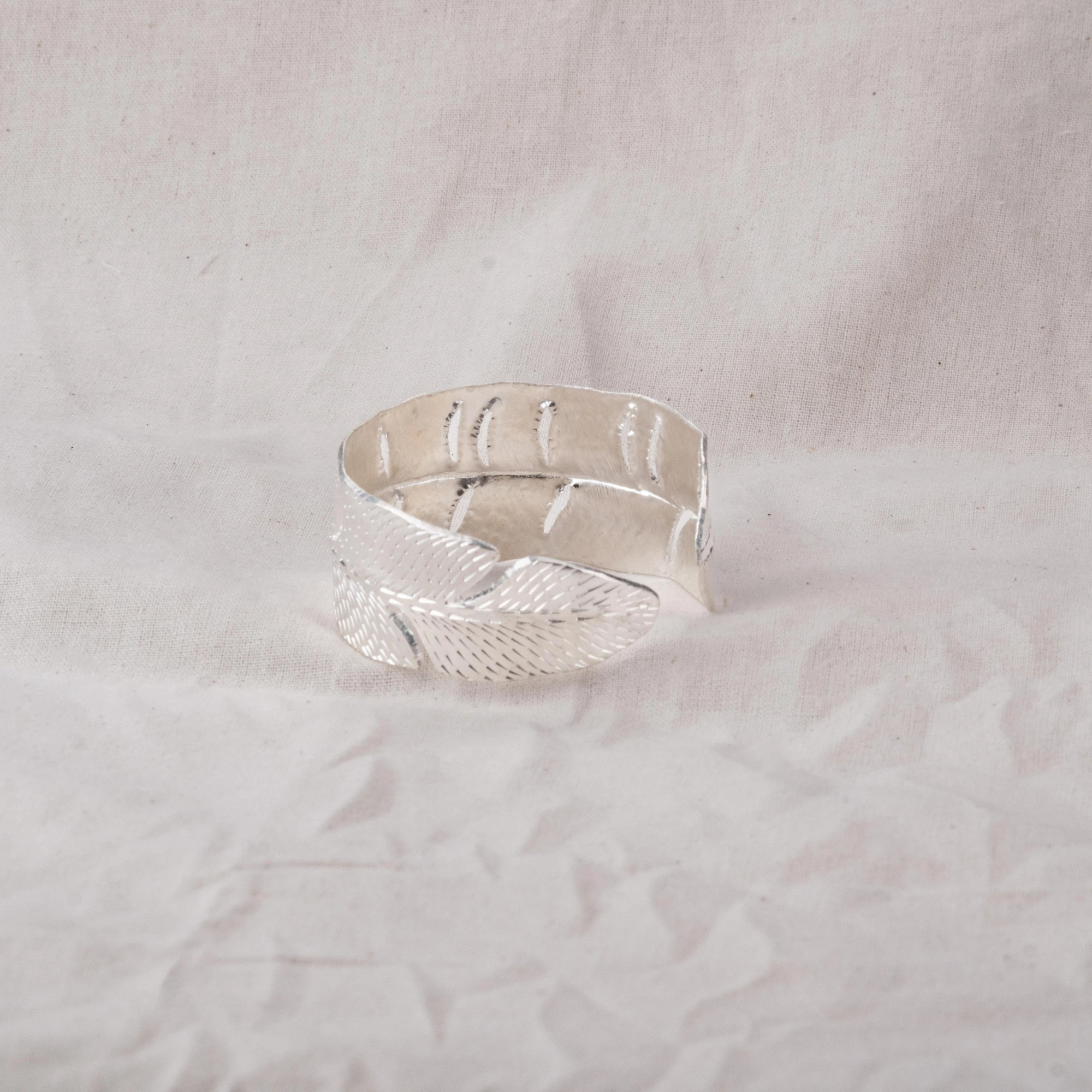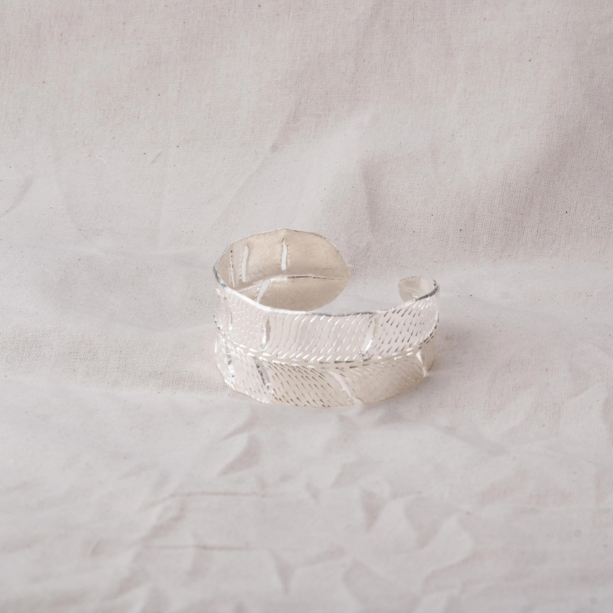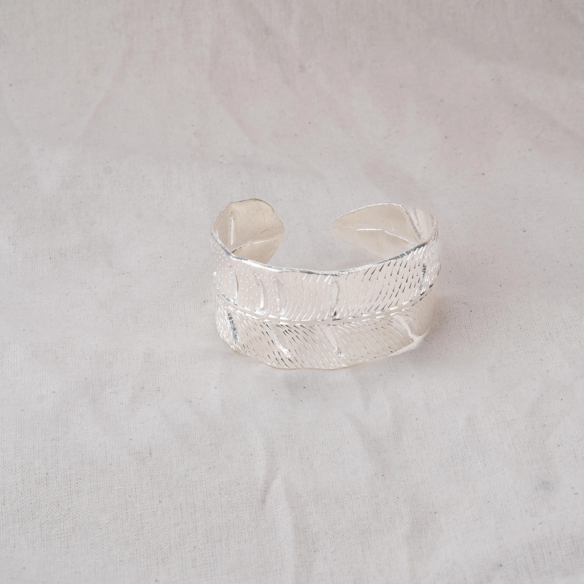 Lông vũ từ lâu đã hiện diện trong thơ ca và nghệ thuật như biểu tượng của sự tự do, của khát vọng vươn mình lên bầu trời. Trên chiếc Vòng tay chạm lông vũ, hình ảnh ấy được tái hiện bằng những đường khắc thủ công, từng gân lông mảnh như luồng gió lướt qua. Bản cuff rộng ôm lấy cổ tay, nhưng chính những nét khắc mềm mại lại làm tổng thể trở nên thanh thoát, gợi cảm giác vừa mạnh mẽ vừa dịu dàng.