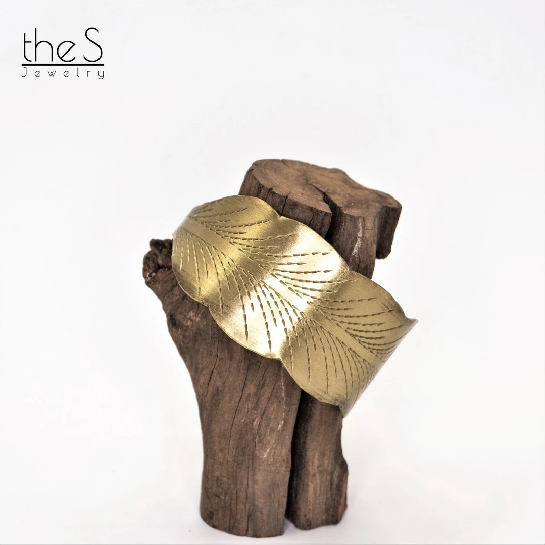 Vòng tay đồng lá dài bản lớn, khắc thủ công đường gân mềm mại. Đeo trên tay, vòng như chiếc lá ôm trọn cổ tay, vừa tự nhiên, vừa sang trọng.
