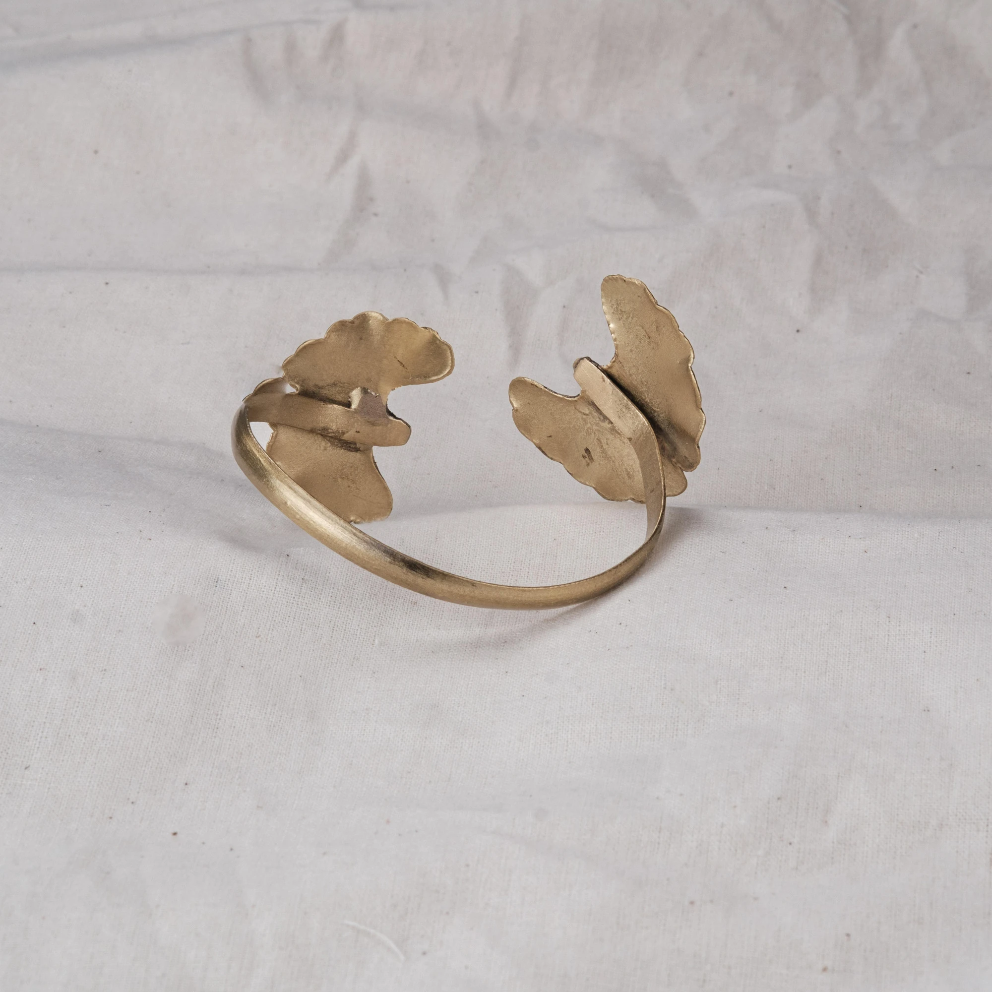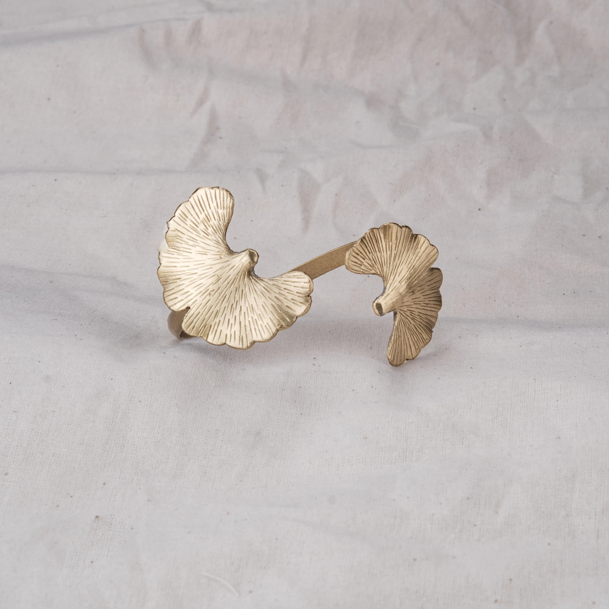 Vòng tay Lá Ginkgo hai đầu với dáng mở ôm cổ tay, điểm nhấn là hai chiếc lá bạch quả khắc thủ công. Đeo trên tay, vòng gợi sự cân bằng, thanh lịch và bền lâu.