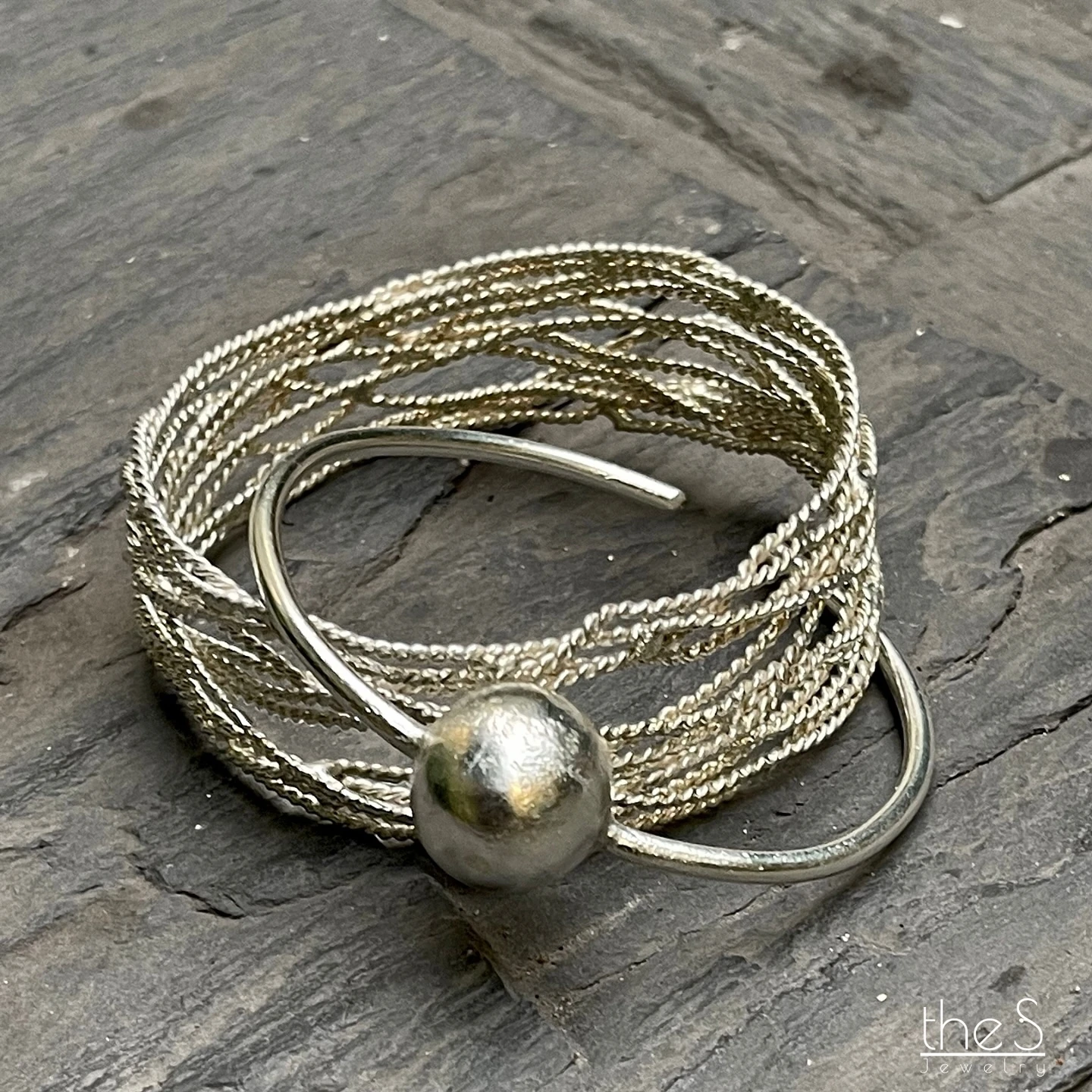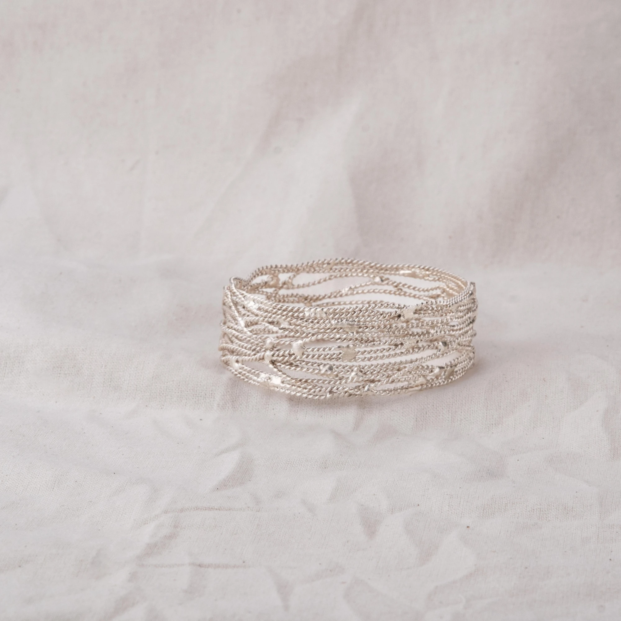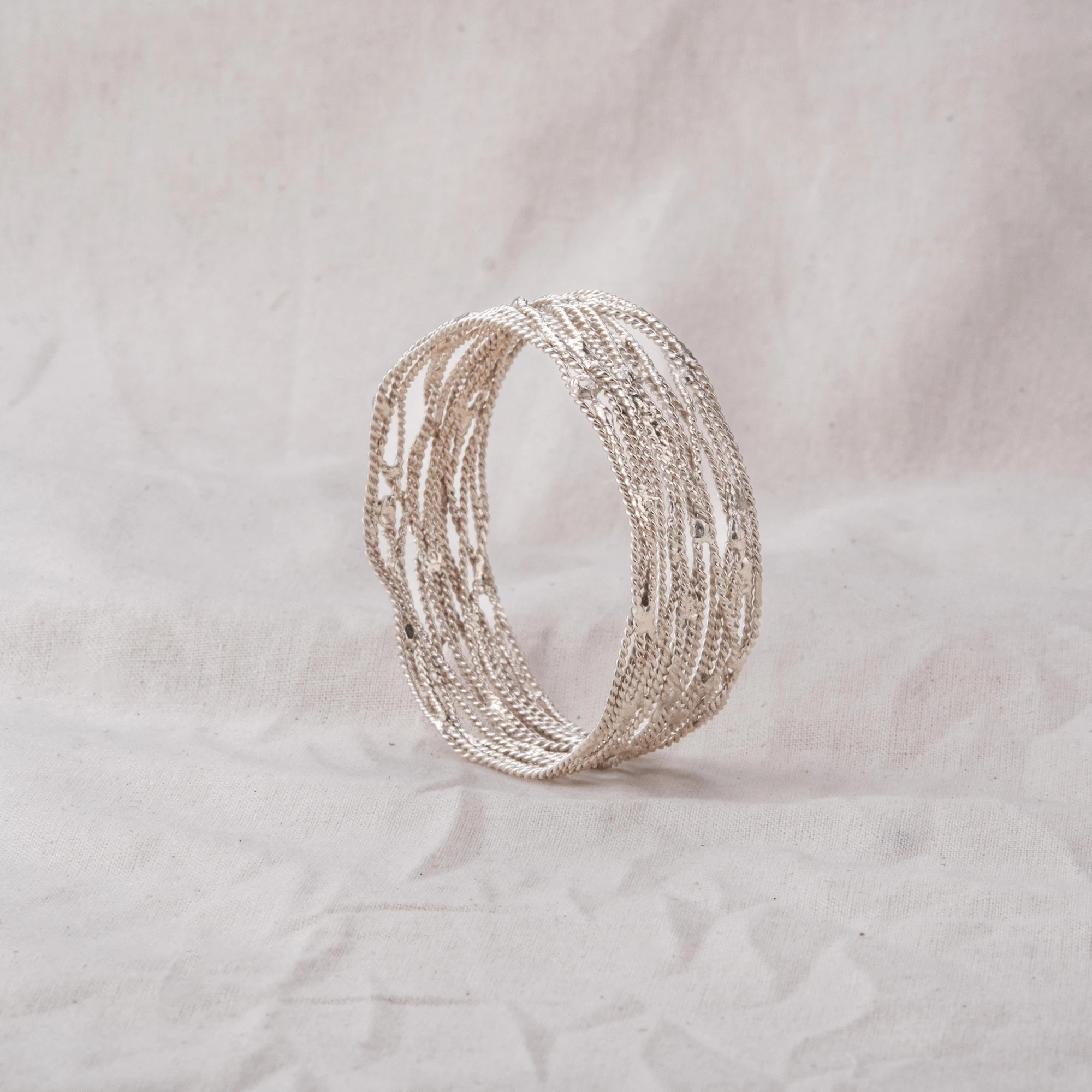 Sự xoắn đan của nhiều sợi nhỏ gợi về kết nối, về sự gắn bó và bền chặt. Ánh bạc lạnh gợi sự hiện đại, thanh khiết nhưng cũng đầy cá tính. Người phụ nữ khi đeo vòng như mang theo một làn sóng sáng, vừa thanh thoát, vừa mạnh mẽ, như một lời khẳng định thầm thì về phong thái.
