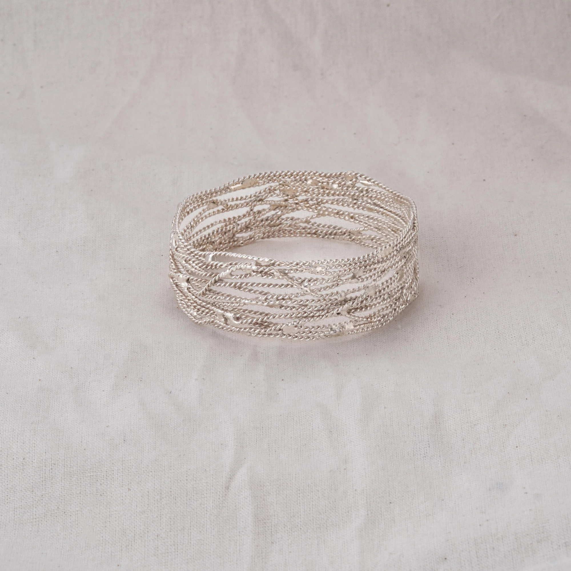 Vòng tay đồng xoắn bạc (mạ bạc) với thiết kế nhiều sợi xoắn đan xen. Ánh bạc lạnh tinh tế, vòng ôm lấy cổ tay như một dải lụa sáng, vừa mềm mại vừa cá tính.