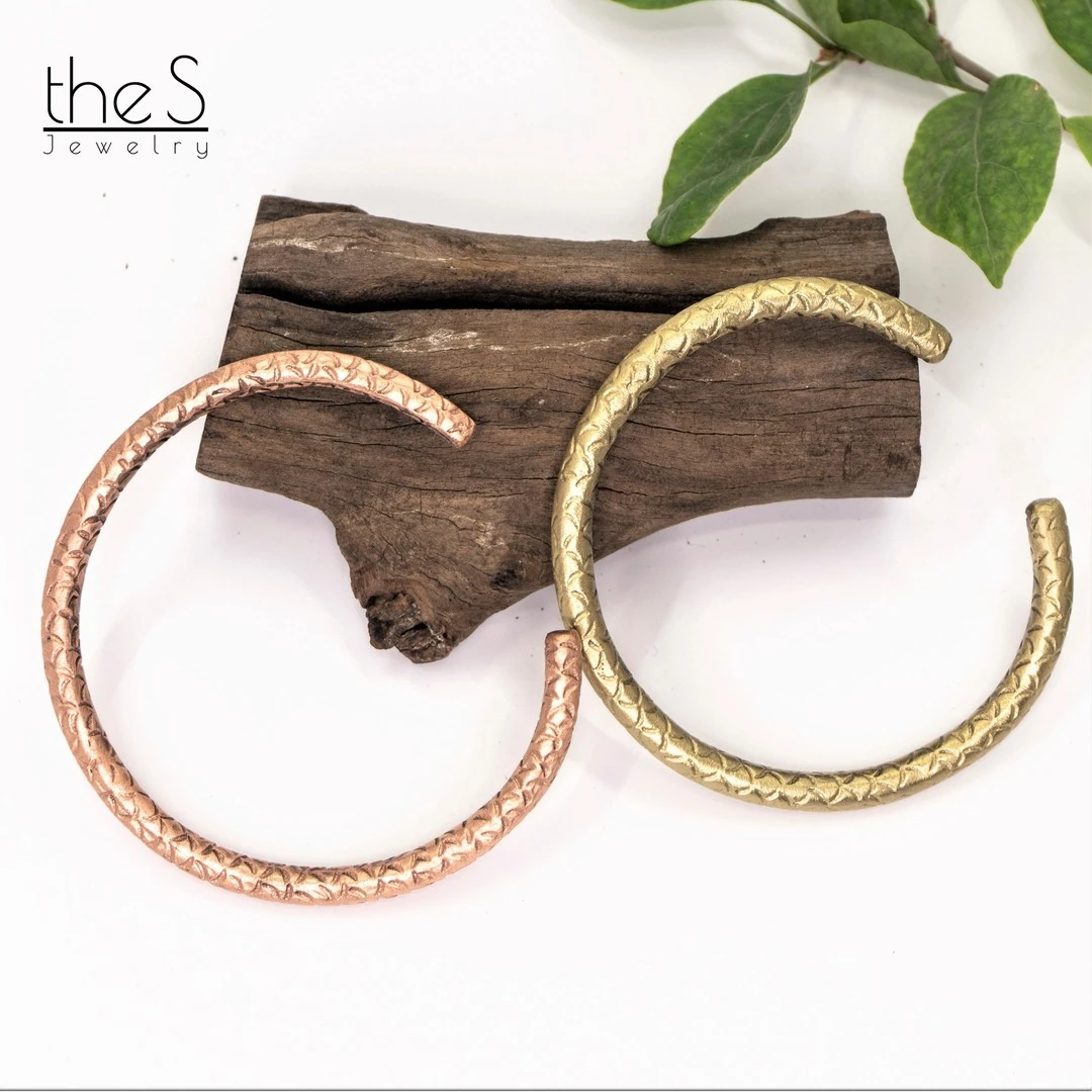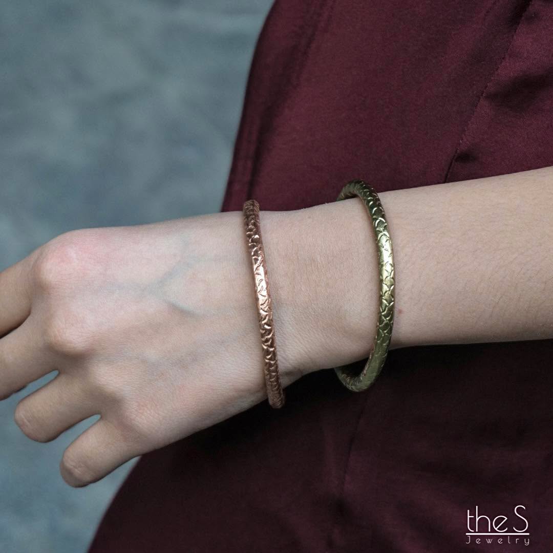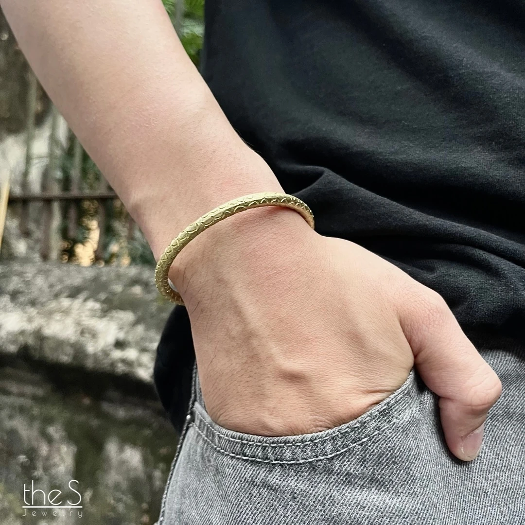 Vòng tay Vảy Cá với bề mặt khắc thủ công hoạ tiết vảy cá li ti. Đeo trên tay, vòng vừa mộc mạc vừa sang trọng, gợi sự bền bỉ và may mắn.